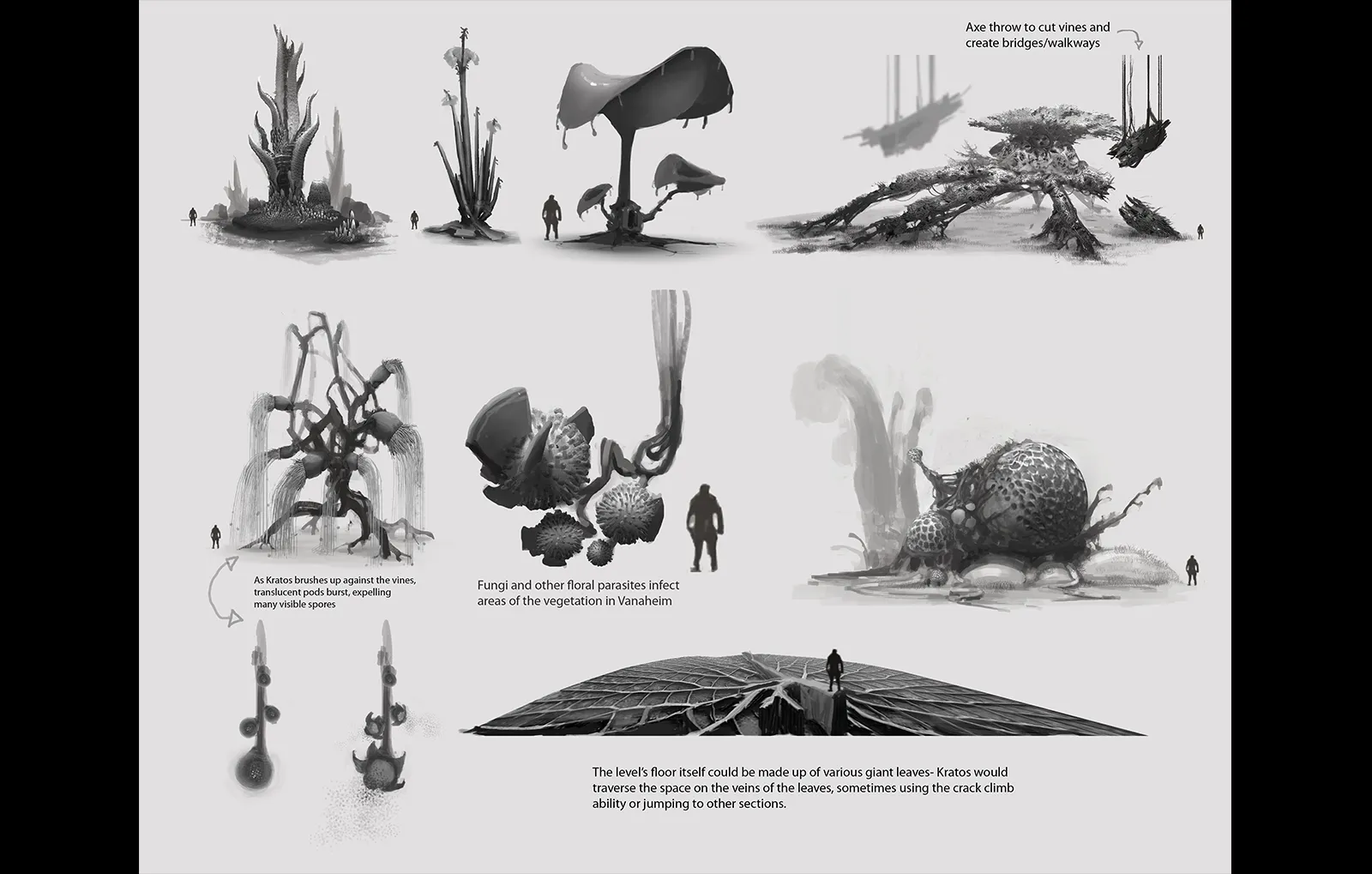 – The surrounding environment could interact with the character (if Kratos brushes-up against the vines, they expell visible spores).