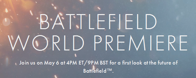 See the future of Battlefield. The #Battlefield World Premiere is on May 6 at 4PM ET. https://t.co/YurgN6rLHW pic.twitter.com/7ULKB6LS47