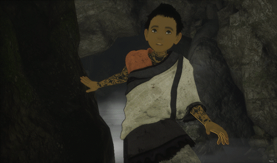 Enough about my emotional fragility, though. The game proper begins with a little narration, which is told from the perspective of the boy protagonist — although his deep, rough voice and use of the past tense obviously indicate he’s aged quite a bit since his adventure with Trico. The old man recounts the time he found himself in a mysterious cave, and that’s where the preview begins: with the boy waking up, confused by the sudden appearance of tattoos on his body and in awe of the giant creature before him.