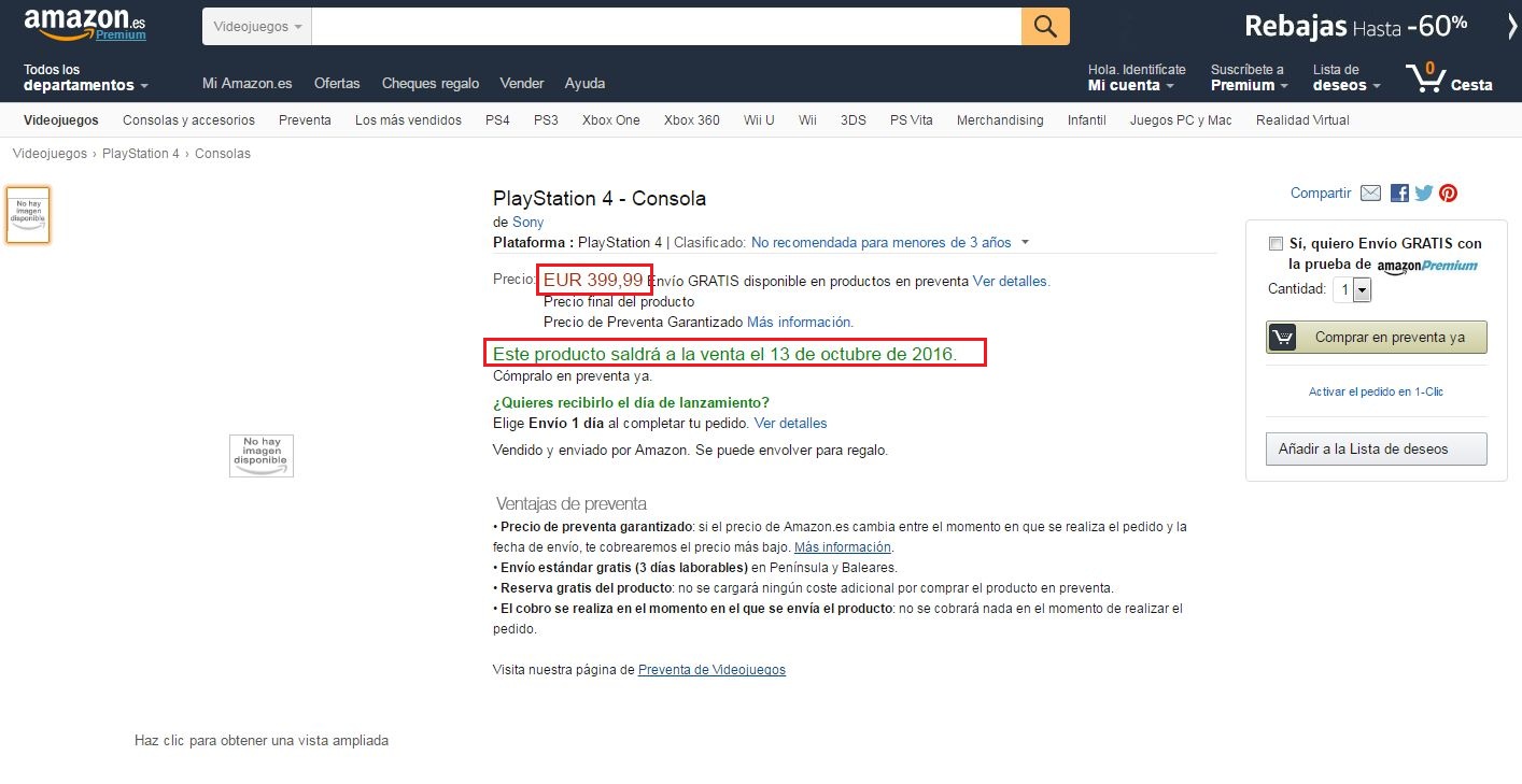 According to an image captured by VGLeaks, Amazon Spain listed a PlayStation 4 for release on October 13, priced at €399.99.