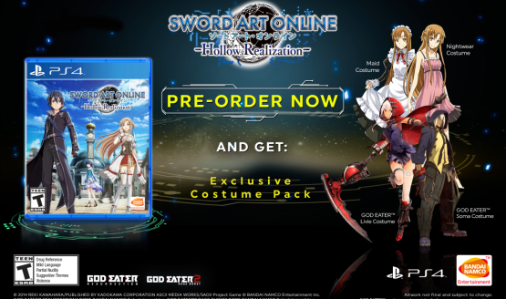 By pre-ordering Hollow Realization for PS4 in North America, you’ll receive an exclusive Costume Pack that include a a Maid Costume and Nightwear Costume for Asuna, as well as God Eater costumes. In Europe, pre-orders come with three exclusive costumes – a nightwear costume for female characters, as well as two costumes from God Eater, Soma’s costume for male characters and Livie’s costume for female characters – and an exclusive lithography signed by Sword Art Online creator Reki Kawahara. The lithography isn’t available with digital pre-orders.