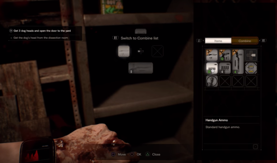 The first video, Volume 5: Survival, sees you picking up an herb and combining it with a first aid med to heal yourself. You may also notice that the current objective shown on-screen is to “get 3 dog heads and open the door to the yard.” The description adds, “Green herbs become even more potent with a new ingredient.”