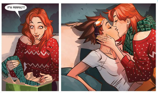 Available to peruse via Blizzard’s official site, Reflections is a heartwarming yarn in which we’re reminded of what’s really important during the holiday season, but one story arc has proven contentious for some members over on the Overwatch forums. It involves Tracer, arguably the shooter’s de facto mascot, who is revealed as canonically queer, seen here kissing her partner, Emily, upon exchanging gifts.