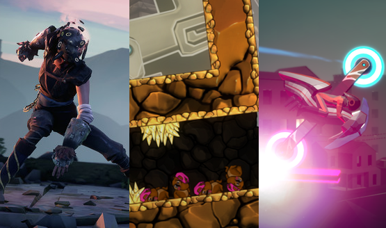 FutureGrind brings Trials-like action with a Uniracers twist. Players pilot a two-wheeled vehicle (albeit one more structured like a unicycle) through difficult courses where they have to match wheel color with the structures they can grind on. It's a highly difficult game, but one that has been very rewarding in preview builds.