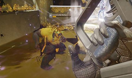 Encounter: There are five platforms in here, one in each corner of the room, and one in the center. Each platform has a ball of light that gives a buff called Pysonic Protection in stacks of 50 that will allow players to touch the water (and subsequently the platforms in them) without getting hurt. Players must stand on each of the corner platforms to lower chains and lock them in place. This needs to be done while defending against the tough Bathers that emerge near each platform. Once the encounter starts, only the middle has the Psyonic Protection buff and the extra two players will need to rotate out on the plates to refresh it.