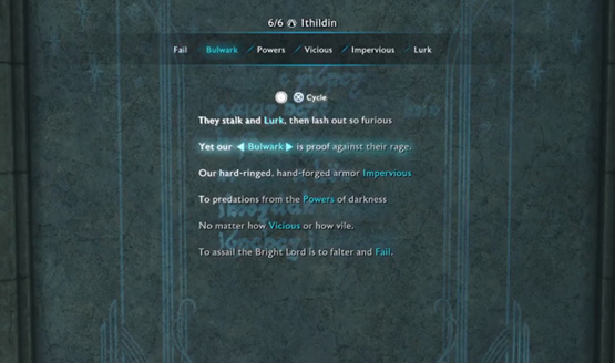 The six Ithildin fragments collected will be words that need to be slotted into the correct sections in a poem. Slot all of the words in correctly, and the door will open. You’ll find the complete poems below, with the correct words to be slotted in bold.