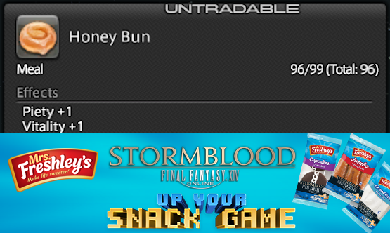 Square Enix has cooked up one of the tastiest promotions of the year (at least, I assume so, I can’t say I’ve ever had any Mrs. Freshley’s snacks). Players that purchase certain Mrs. Freshley’s snacks (Jumbo Honey Bun, Cupcake, or Grand Iced Honey Bun) will be able to get a special in-game item in Final Fantasy XIV. This promotion will net players a special Honey Bun that’ll come with a 4% experience boost. That’s pretty sweet.