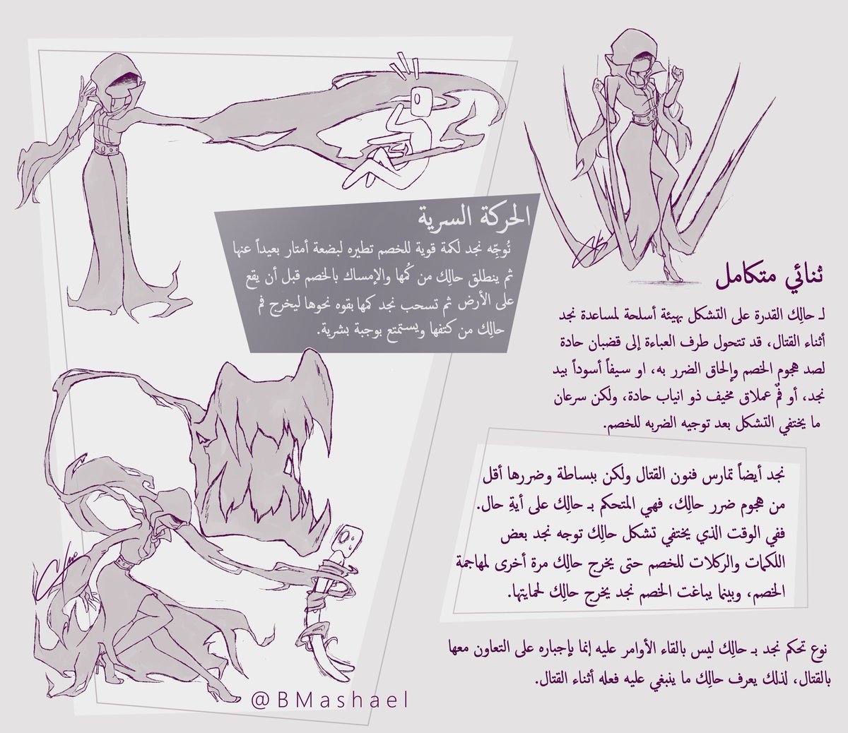 ResetEra users have translated some of the text that appears in the images. According to user BaShaBeSho, Najd wears an abaya that she uses as a weapon because it’s possessed by a demon called Halek, which means “extreme darkness.” The demon can appear while fighting, and disappear after launching attacks. BaShaBeSho further wrote (verbatim):