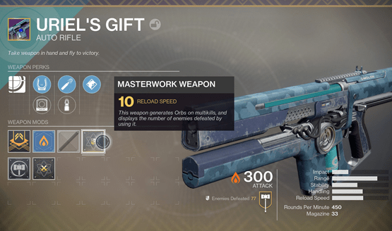 - Masterwork Weapons – Legendary weapons can drop as Masterwork tier versions, or can be upgraded into this tier. They will generate orbs on multi-kills for you and your allies. They have a re-rollable stat bonus that will make each Masterwork weapon unique. These can drop from any legendary engram source as long as a player is over 250 Power level. If you dismantle a Masterwork, it will drop materials that can be used to upgrade non-Masterwork legendaries.