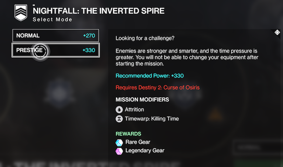 The trophy in question is called “The Prestige” which requires players to “Complete the Leviathan Raid or a Nightfall Strike on Prestige difficulty.” That difficulty has now been raised to 330 Power level, and it isn’t possible to reach that cap without buying the Curse of Osiris expansion for Destiny 2. In addition, it brought up the difficulty of the standard modes for the Raid that Nightfall, so that players who don’t have the expansion will have a more difficult time completing this content, even though they still have access to it.
