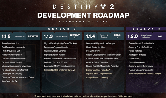 Bungie revised the Destiny 2 update roadmap that they published in January, putting some delays on features, but adding others. The biggest features being delayed are the unique Nightfall Strike weapons and Mod System improvements, which will now be delayed past the big 1.2.0 update planned for May. The Exotic weapon and armor tuning changes previously planned for the March update will now be launching alongside Destiny 2 update 1.2.0 in May.