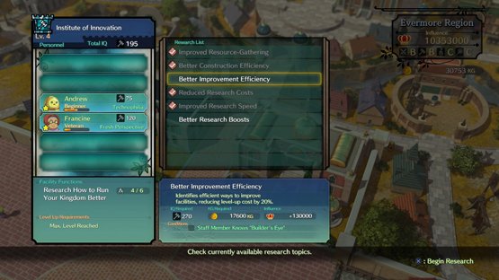 Citizens of Evermore can gain IQ in their areas of expertise by leveling up. Ni no Kuni II isn’t really clear on how to level up citizens in Evermore, but it’s fairly easy to do. In the Kingdom Management menu, click on Citizens and find any with a blue arrow next to their picture. Press the Options button to level up the citizen, giving them a boost to IQ. The game won’t tell you when you have citizens to level up, so check back here often.