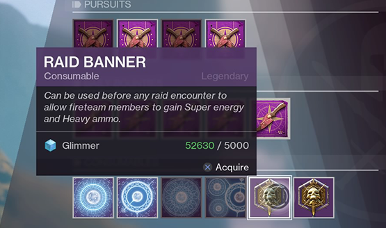 Once you reach the Dreaming City, locating the destination vendor Petra Venj provides some items for purchase. One of those items is a consumable called a Raid Banner that “can be used before any Raid encounter to allow fireteam members to gain Super energy and Heavy ammo.” The consumables cost either 5000 Glimmer or three legendary shards.