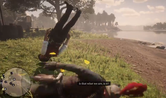 With so many people playing Red Dead Redemption 2, players were bound to come across more hilarious glitches. One of the funniest so far is this bug where gravity seems to have entered some kind of twilight zone near the game’s third camp. As Arthur walks near the water we see one person begin to tilt awkwardly. Arthur follows suit, casually talking to Dutch as he goes from vertical to horizontal. A crazy spinning begins and Arthur hits Dutch’s legs, knocking him from reality into an insane horizontal spinning routine that is apparently how outlaws bond in 1899.