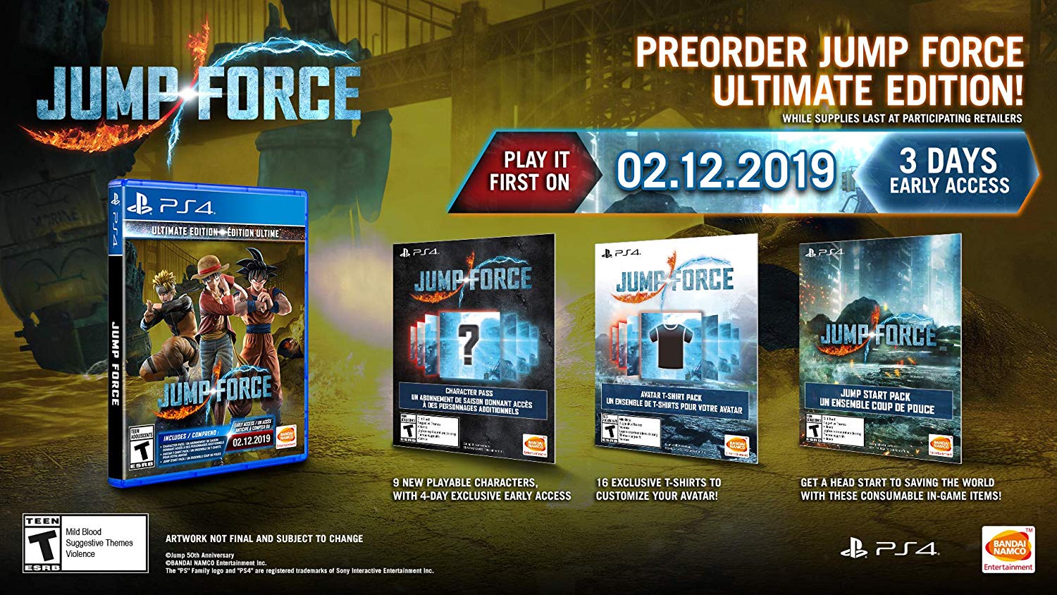 The ultimate edition is a little bit pricier, but it comes with a significant number of goodies. For starters, you will get three days of early access to Jump Force, so you will get to play it February 12, 2019. In addition to the bonuses from the other editions, you will get access to exclusive DLC. This will give you access to a Jump Starter Pack, which will give you in-game items, along with 16 avatar T-shirts.