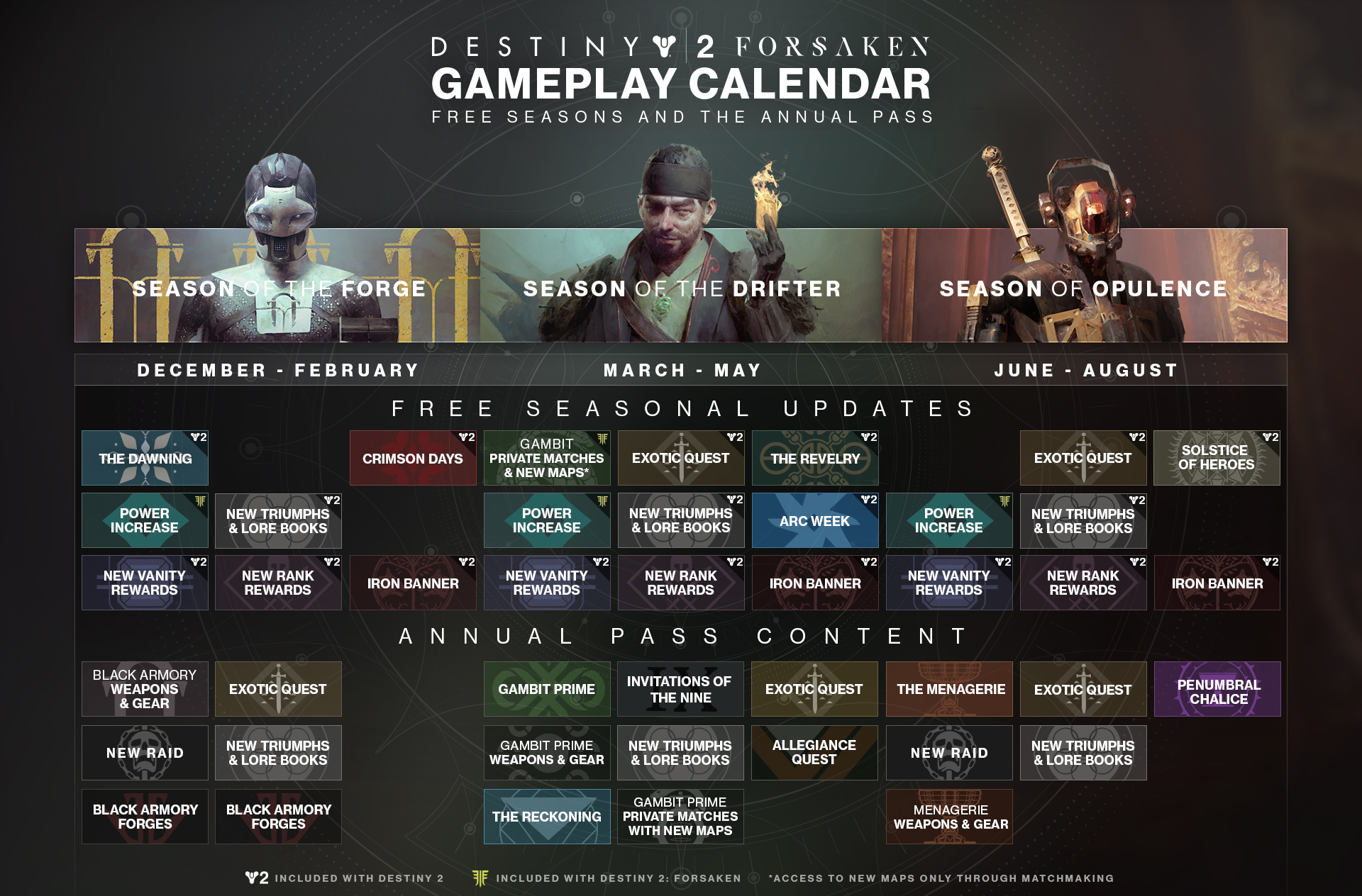 Season of Opulence is focused on discovery and mystery, so there’s not a whole lot known right now about what’s coming in this season of content, but Bungie did provide a content calendar for what we do know. Here’s what’s coming, both free seasonal updates and paid content with the Annual Pass:
