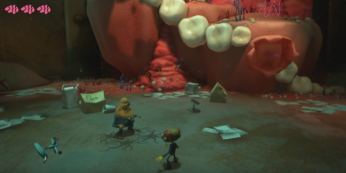 The gameplay demo takes place inside the mind of the villain from the original game, Dr. Loboto. Raz (who has now become a full-fledged psychonaut) and his team are trying to discover who Dr. Loboto is getting his orders from. In an effort to do this, they have constructed a fabricated reality where they all work together in an office space, but Dr. Loboto quickly starts to see through it. His actual reality, where he is a dentist, and the artificial office start to fuse into one, and this is where Double Fine really shows its strength in environment building. Not only do the areas have a beautifully unsettling look to them, but puzzles and traversal fit with the clashing themes of the area. For example, Raz has to shoot a uvula dangling in a mouth door in order to keep it open. There is also a section where you have to replace a tooth that’s fallen out of its socket to create a climbable platform. This looks like it should keeps the player on their toes because they is always a unique way to solve a puzzle, instead of just trying to locate the same switch that they’ve already seen several other times in the game.