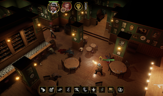 One does not simply walk into a speakeasy and declare it theirs, however – you have to shoot the joint up first! It was within this building that we got our first glimpse of gameplay in Empire of Sin. It’s a turn-based affair, where characters have a set amount of action points, and can use them to move, fire weapons, reload, or perform other actions. If a character is standing near a wall or an object which can be used as cover, they will automatically crouch near it, and a shield icon will appear above them to indicate to the player that this character has increased defense from their current location.