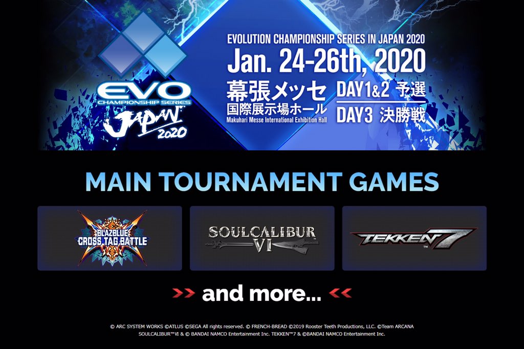 We will hold #EVOJapan2020 on Jan 24-26th at Makuhari Messe! MAIN TOURNAMENT GAME: BLAZBLUE CROSS TAG BATTLE, SOUL CALUBUR Ⅵ, TEKKEN 7…and more! Please Check https://t.co/frW81zyVUI and @EVOJapanNews ! pic.twitter.com/gzwMEuRG2W