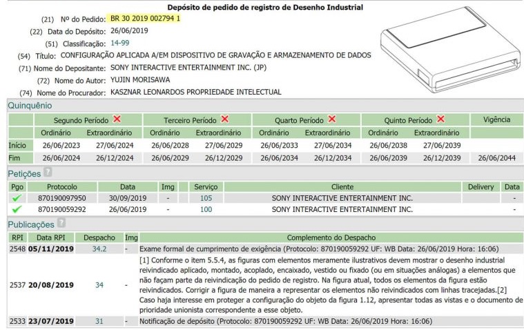 LetsGoDigital, the folks who first discovered the PlayStation 5 dev kit, found the patent on Brazilian Instituto Nacional da Propriedade Industrial’s (INPI) website. The application was filed in June 2019 and was published last week on 5th November. A screenshot of the latest filing can be found below (click or open in new window to enlarge).