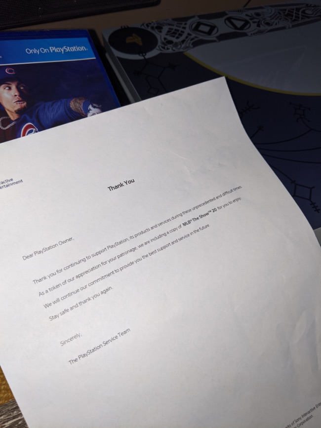 The letter thanks the PS4 owner for continuing to support the PlayStation brand during these trying times. As a token of appreciation, the Service Team mailed the extra game back along with the console. According to MP1st, however, Redditor pnut88 won’t be holding on to MLB The Show 20, since they’re no fan of the baseball sim. In communicating with the user, MP1st learned the game will instead go to another Reddit user, who enjoys playing MLB The Show 19 with his wife but hasn’t yet purchased the latest game in the franchise. It’s awesome to see one kind gesture paid forward to benefit someone else.
