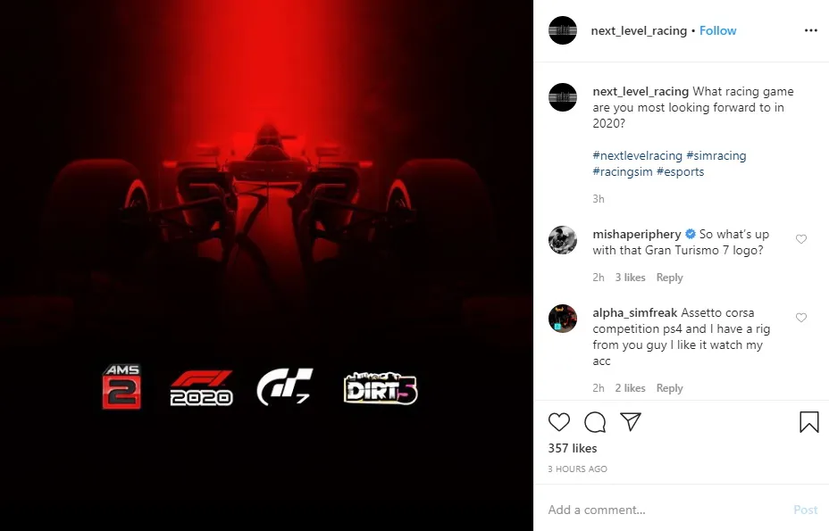 That story begins with an Instagram post from Next Level Racing, a racing cockpit manufacturer that makes officially licensed PlayStation products. The Sixth Axis reported that the now-deleted post (screenshot below) showed a Gran Turismo 7 logo (among other confirmed titles), asking what racing game people are looking forward to in 2020.