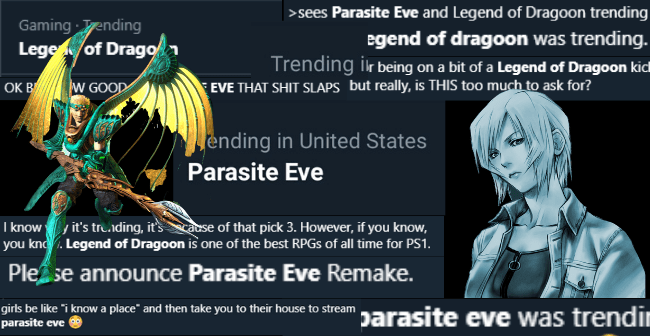 That’s why, upon waking up this morning and properly fascinating, I was struck with yet another Twitter trend conundrum: Why are the PlayStation 1 classics Parasite Eve and Legend of Dragoon trending on the Twitter front page? Did I miss some kind of early morning announcement?