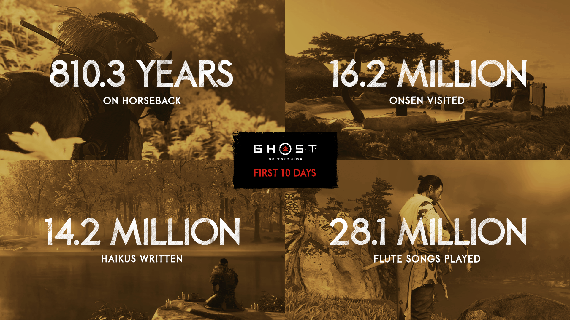 Players have spent a combined total of 810.3 years on horseback. 16.2 million Onsen (hot springs) have been visited, raising Jin’s health by incremental amounts through soothing baths. 14.2 million terribly composed haikus have been written at beautiful spots around Tsushima island. And 28.1 million flute songs have been played. Yes, Jin can play the flute, changing the weather at a moment’s notice. These numbers are all in the first 10 days, tracking through July 27th, so if you’ve added to them in the last four days, they won’t be counted among these stats.