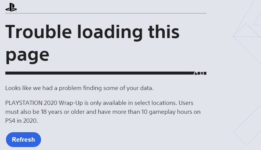 Some players are also reporting issues getting it to work, even in qualifying regions and with plenty of play time. When I try to run my stats, I got the following error telling me there was “Trouble loading this page.” I’m almost certain Utah falls within the “select locations,” and I can assure you I have well over 10 gameplay hours on my PS4 in 2020. Maybe it just didn’t want to shame me with how much Destiny 2 and Call of Duty: Warzone I played during the year. It was… a lot. (Update: Try refreshing this page a whole bunch. I was eventually able to force mine to work. The system may just be overloaded.)