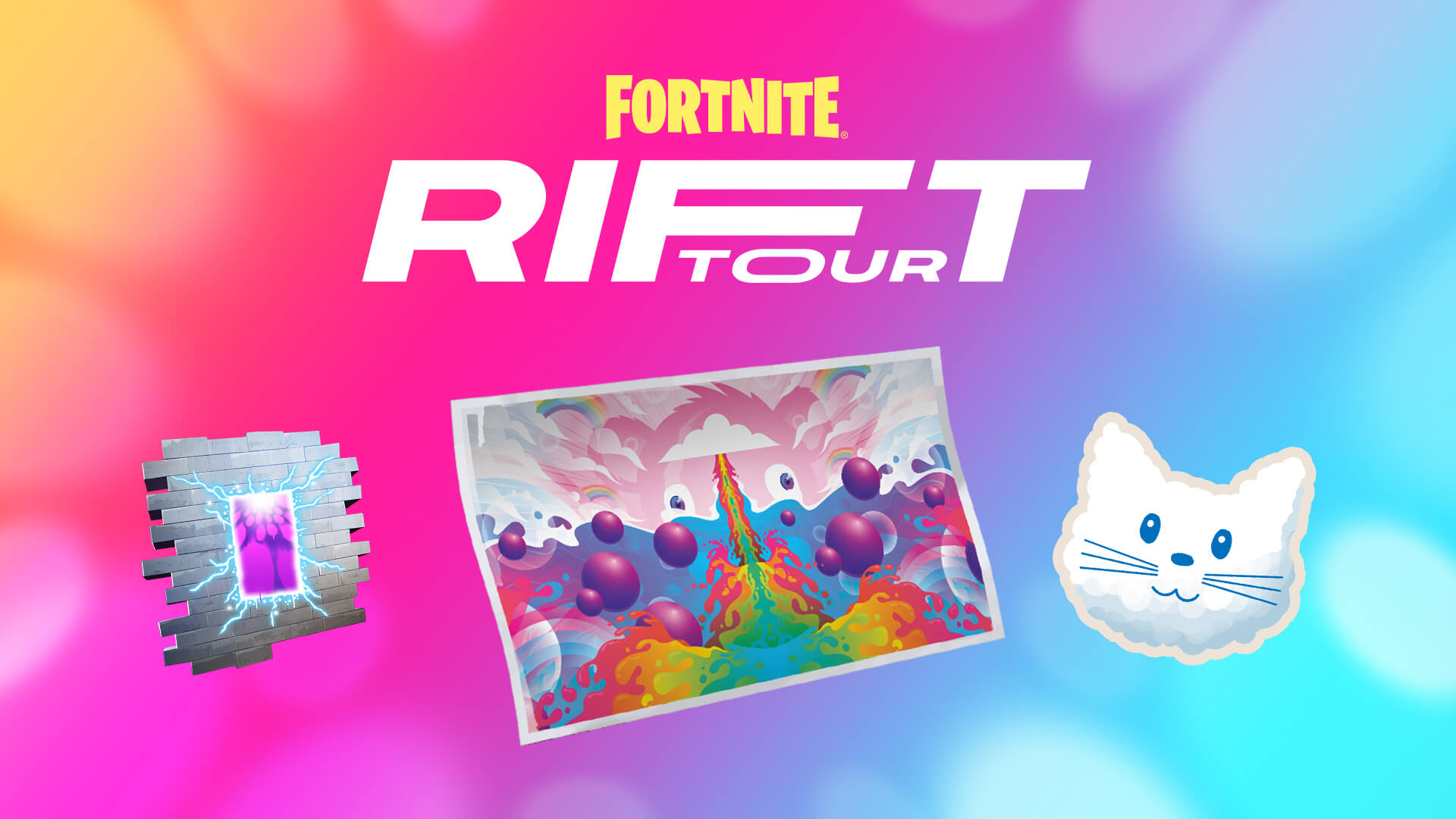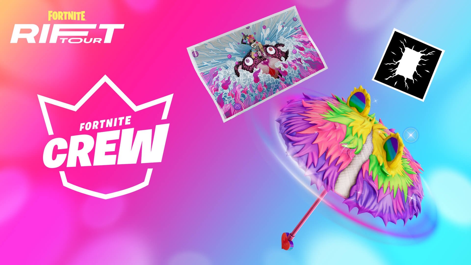Every player who attends the show will get a free Cuddly Cloudcruiser commemorative umbrella. Active Fornite Crew subscribers will also get a special Rainbow Cloudcruiser Umbrella, Skye up High loading screen, and Rift Tour-themed banner as a log-in bonus. Complete in-game Rift Tour quests to also receive a Cosmic Cuddles loading screen, Rift-sterpiece Spray, and Cloudy Kitty Emoticon.