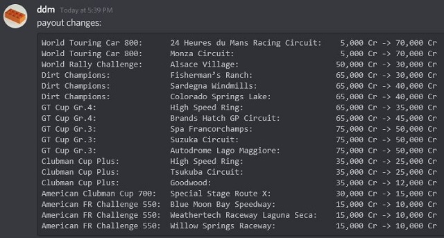 According to a Discord user named ddm (via Reddit), while the v1.07 patch has fixed the payouts for a few World Touring Car 800 races, it has slashed many others that were being used to grind credits (it caused servers to crash too). The full breakdown of changes to credit payouts can be seen in the image below.