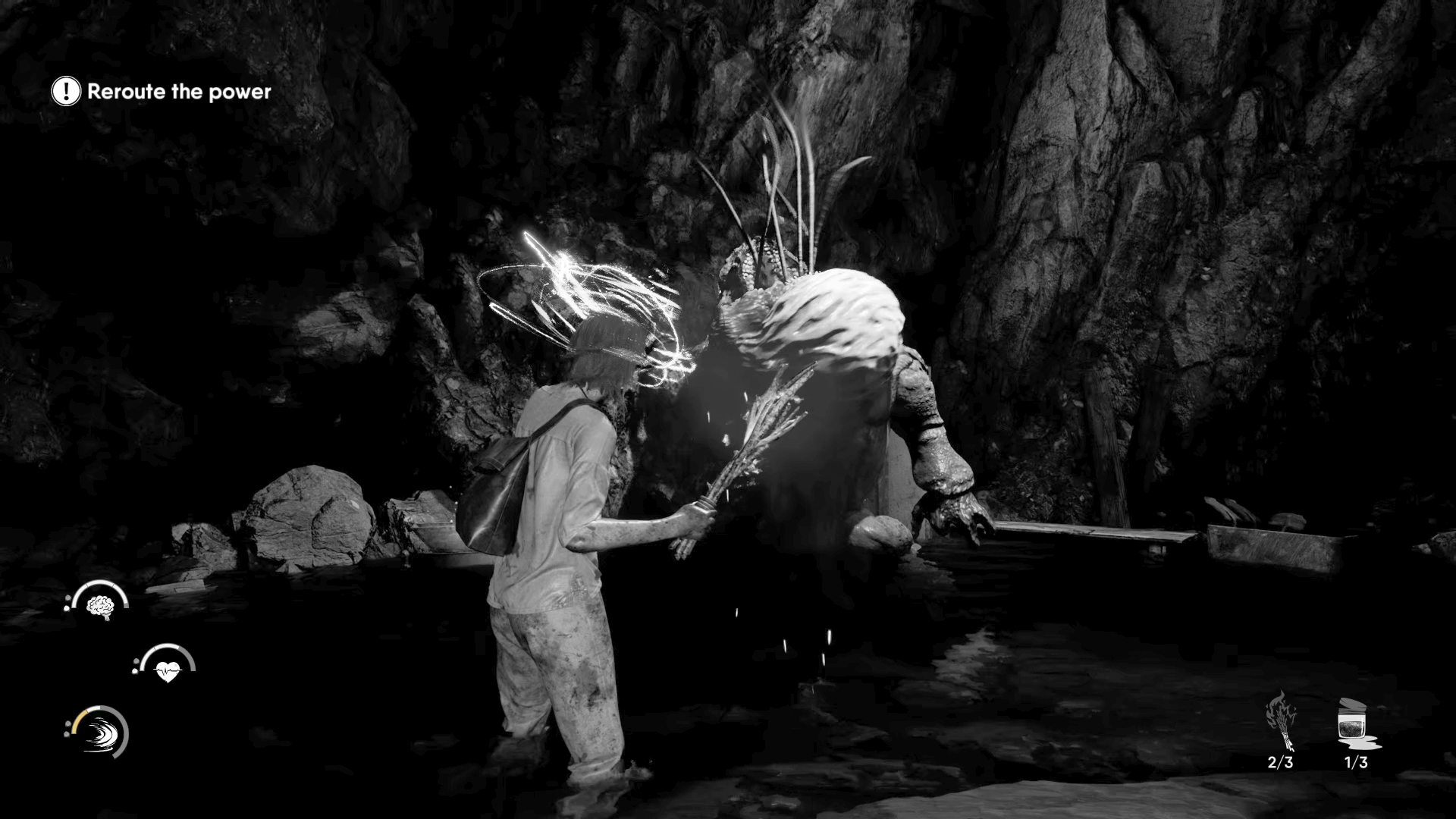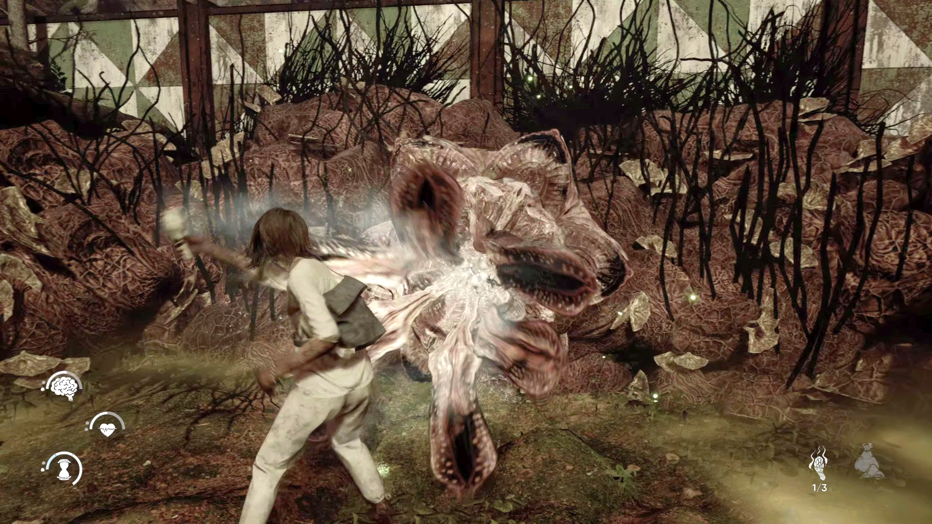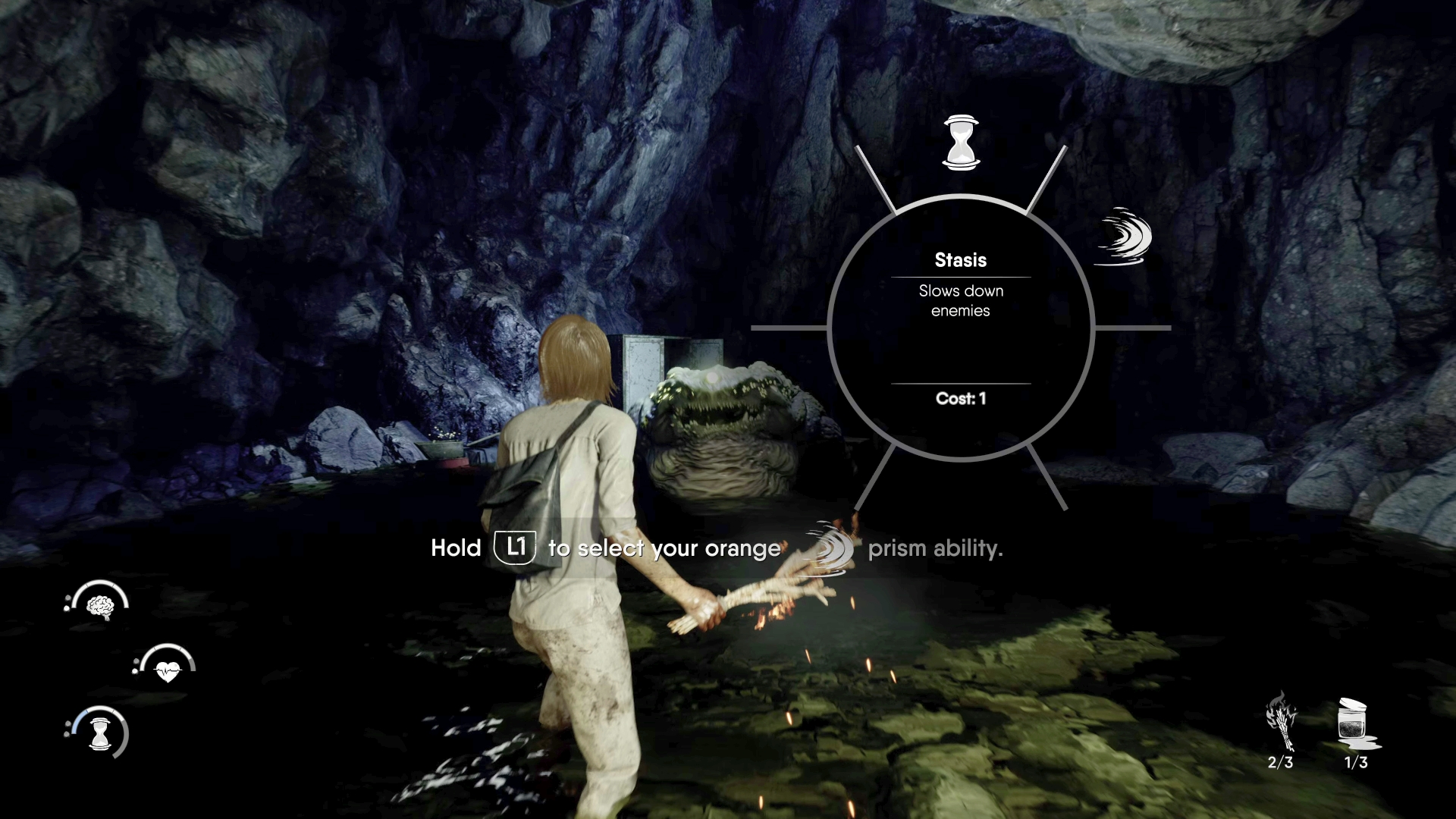 Jess has three health bars, each relating to her current overall well-being. Mind, Body, and Spirit each get their own status level, and while healing can be performed on each by using a crystal with a press of the directional pad, holding a button can also trade some Spirit health for Mind. If Mind ever dips to zero, then Jess will suffer a panic attack, which affects how she can perform in combat. If Body ever hits zero, then she’s dead and the game must be reloaded from a checkpoint. We didn’t see what happens if Spirit hit zero, but this also has its own consequences.