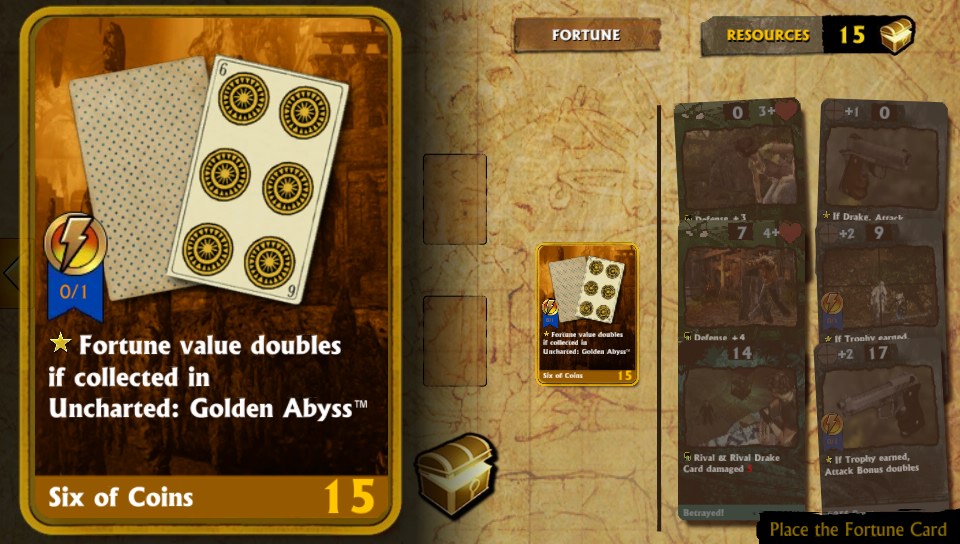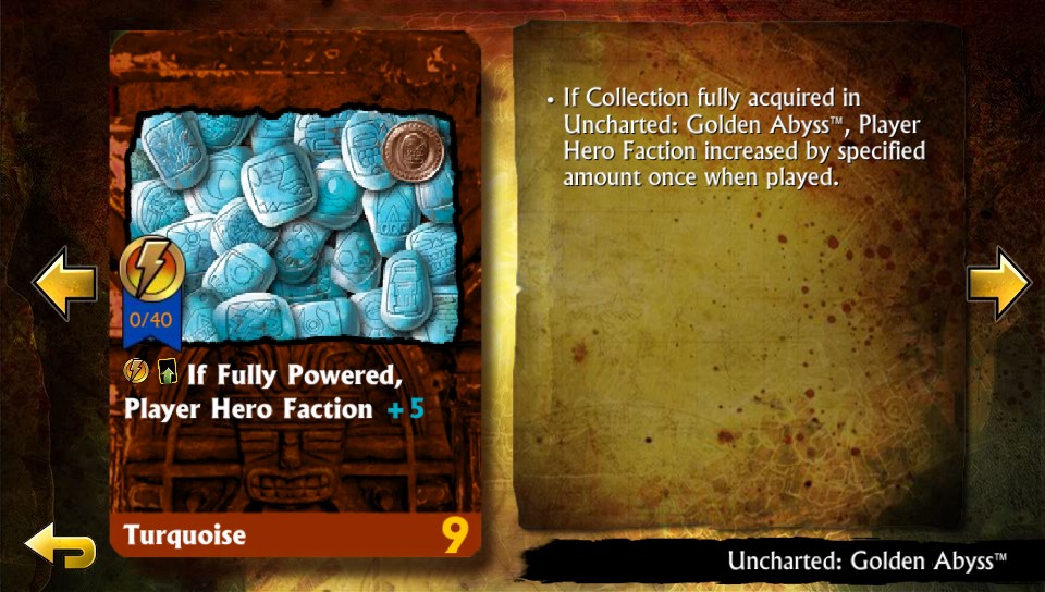 In fact, I actually felt encouraged to close Fight for Fortune and launch my newly downloaded PlayStation Plus copy of Uncharted: Golden Abyss on numerous occasions. Many cards in Fight for Fortune let you know that if you’ve collected the treasures in Golden Abyss that they’ll have increased power and abilities. This of course leads to imbalance in online play which halves the value of Fight for Fortune for any sane gamer who isn’t going to immediately go out of their way to get the platinum trophy for Golden Abyss.