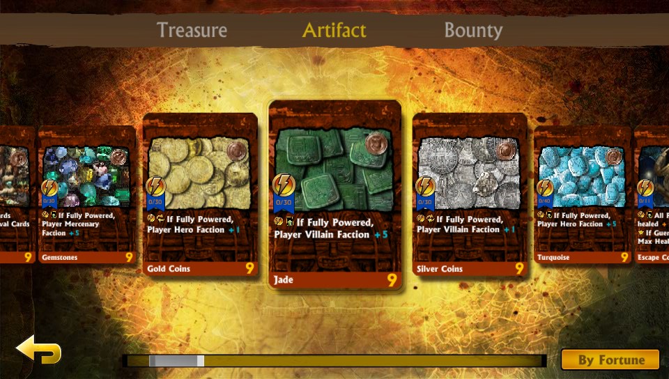 Fight for Fortune gives two players a deck of cards to draw from, with each card categorized into one of three classes: hero, villain, or mercenary. To compliment these attacking and defending figures, players will also choose a treasure and action card in their turn. These three can work together or you can “cash-in” your fortune card to increase your bank of expendable gold.