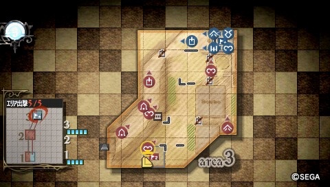 While the first game used a story book as its base of navigation, and the second went with an overhead view of a military school campus, the third now goes with maps of battlefields. Each chapter begins with a section of a map, upon which a home base, battle locations, and story points are marked. Things must move in chronological order though, so not all cutscenes or battles will be immediately available. At the end of a chapter, players are presented with a new map featuring a different part of the war zone, but at any time between segments, one can turn back to previous maps and replay its skirmish or story scenes.