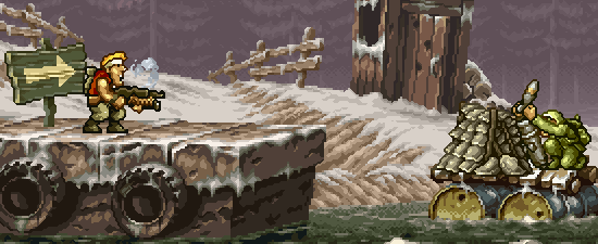 You can occasionally enter mechs called (spoiler warning) Metal Slugs that provide increased firepower and a health bar, along with powerful sub-attacks like missiles; you can also ride on a camel with a powerful cannon strapped to it and a few other strange mounts, adding more character to the game. Players can also be turned into mummies or become overweight from eating too much food (which adds to the life-giving high score), which slow the characters down but are curable with power-ups or time.