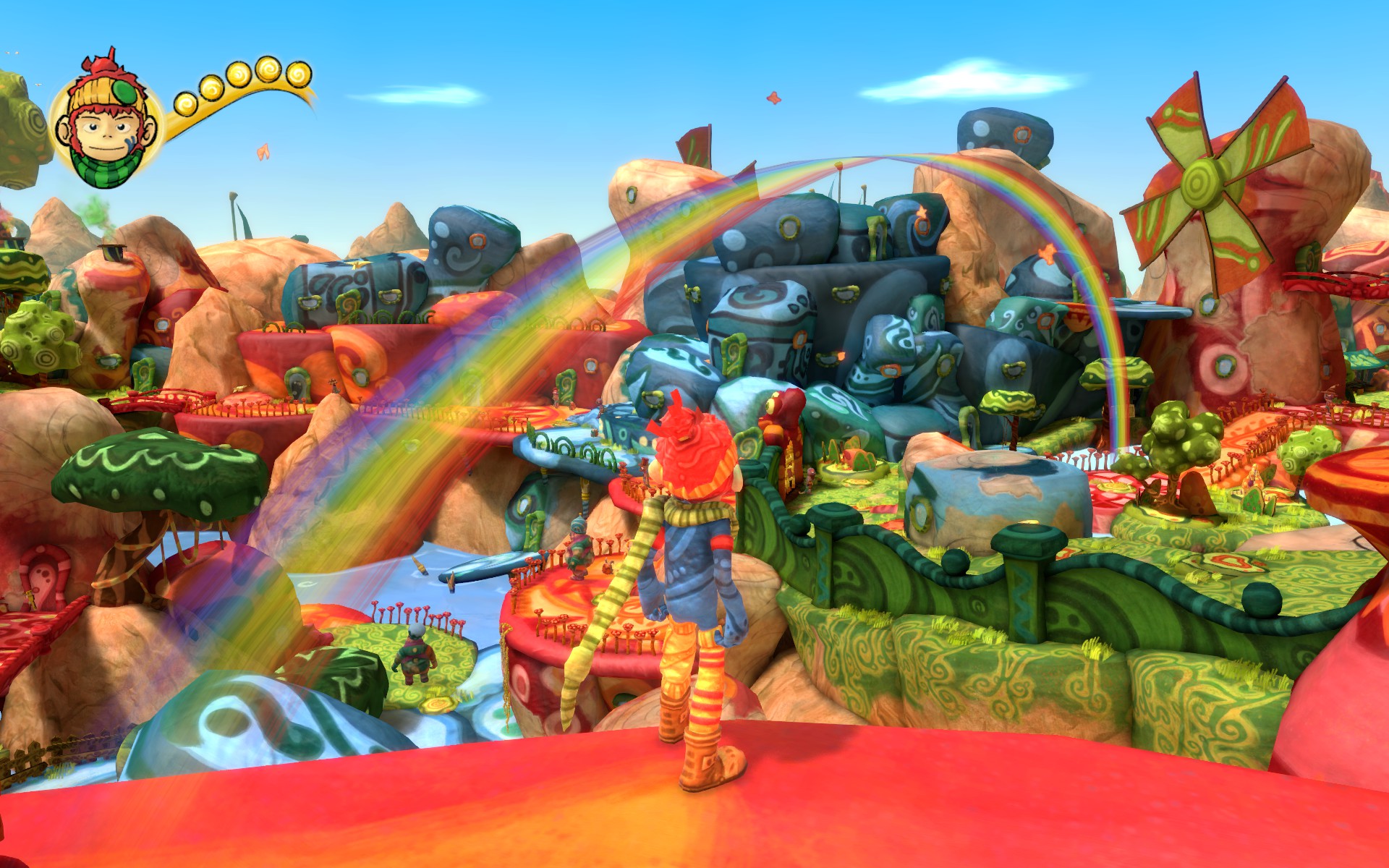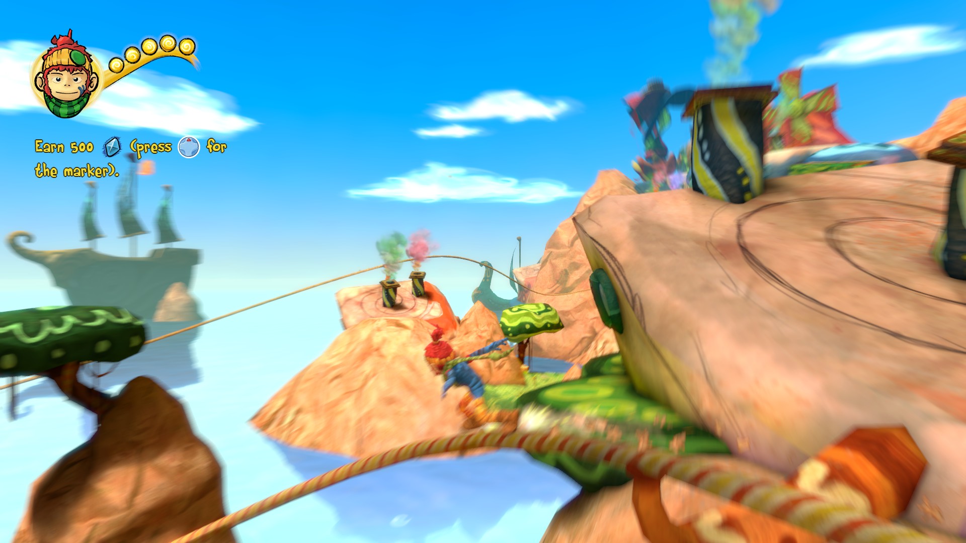 In this City of Colors, you play as Koru, a young monkey boy living in the Outer District, a place where colors can live freely. Koru finds out he is a tinker and is now on a mission to travel throughout the worlds of Red, Green, and Blue to unite to colors and free everyone from the bleakness that has swept through the land. With your good friend Tap along for the ride, Koru must gather the powers of each district and defeat the purple spirit who has started to turn the world white. The story is a unique twist on the world’s tension between people from different backgrounds or locations, or at least that is how I saw it. Told through funny sounding text dialogue boxes, similar to LittleBigPlanet or Doki-Doki Universe, The Last Tinker has a refreshing story and funny set of characters that make the world very enjoyable.