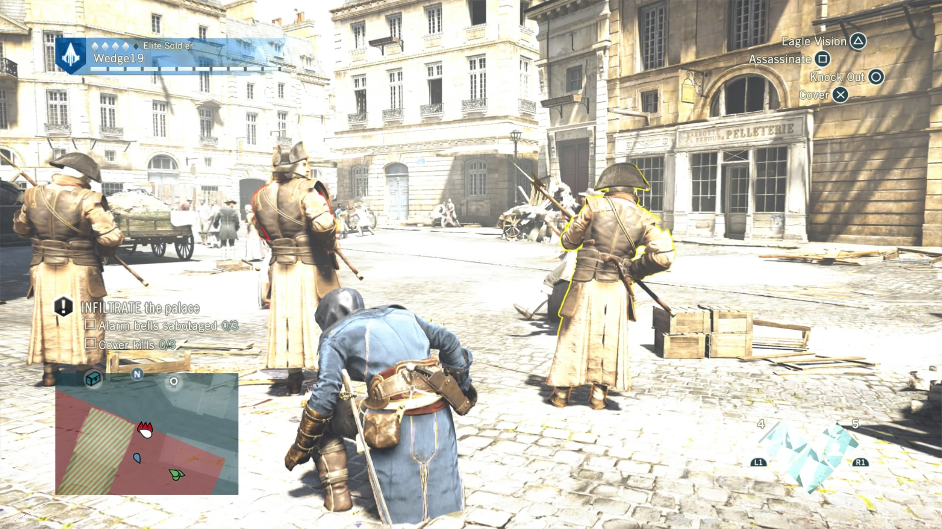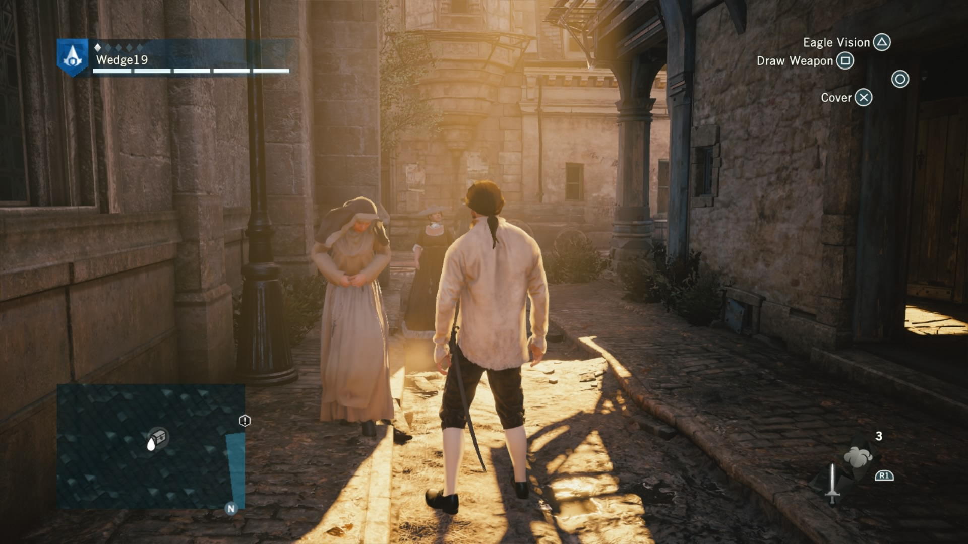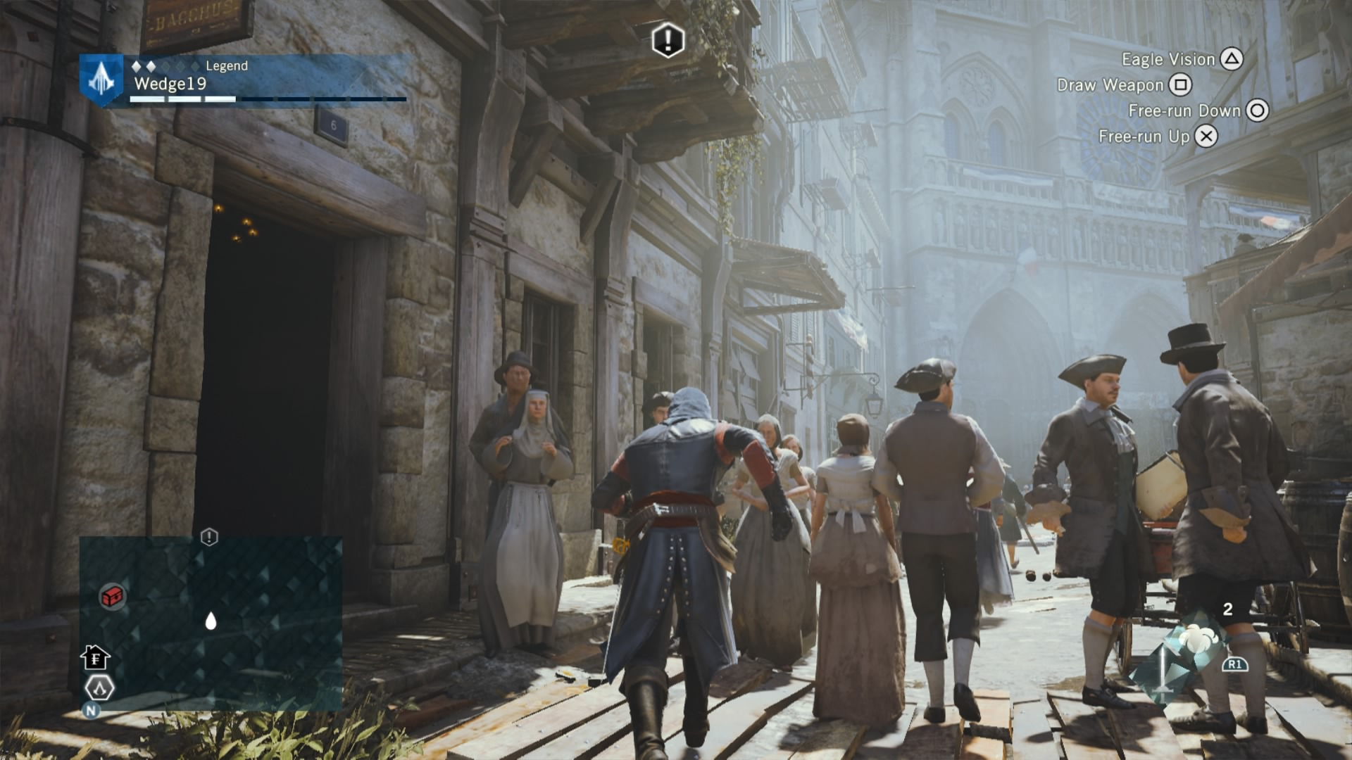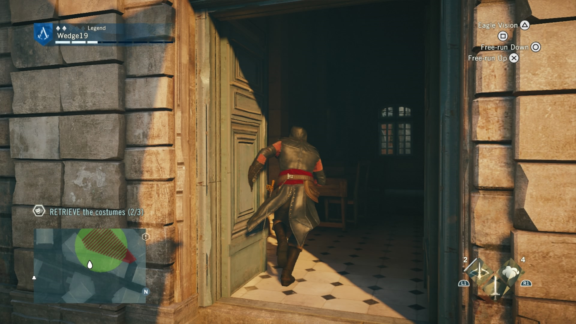 To combat this difficulty progression, Arno can be fully upgraded by buying or earning new gear, from weapons, to his hood, and even down to his pants. That’s right. Unity has customizable Assassin pants. Each of these pieces of gear give Arno a different look and different increasing stats, depending on if you prefer to focus on health for brute force, or stealth for the silent approach. If you are going for stealth, there is also a dedicated stealth button in addition to a cover system to allow Arno to bypass fights and take out enemies with a reticent hidden blade in the shadows. This seemingly basic addition drastically changes the way that Unity can be played, and allows for Arno to feel more like a true Assassin.