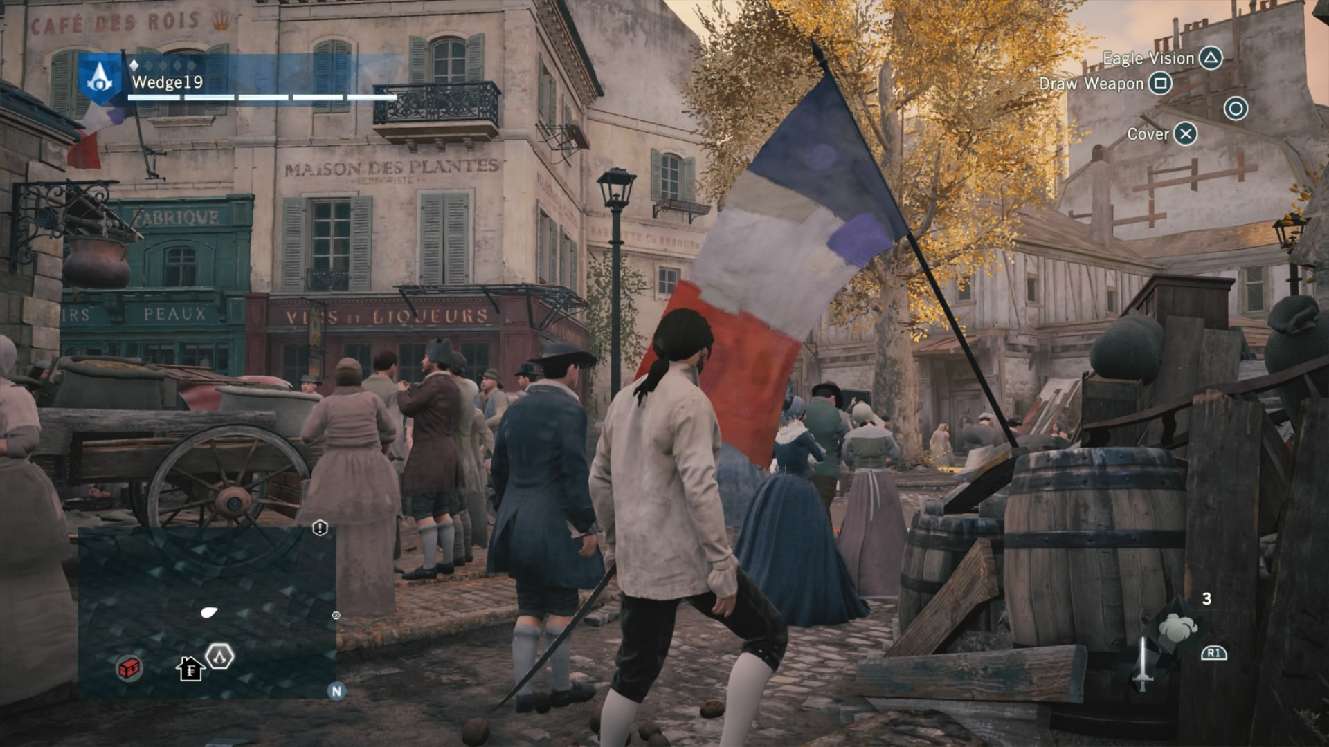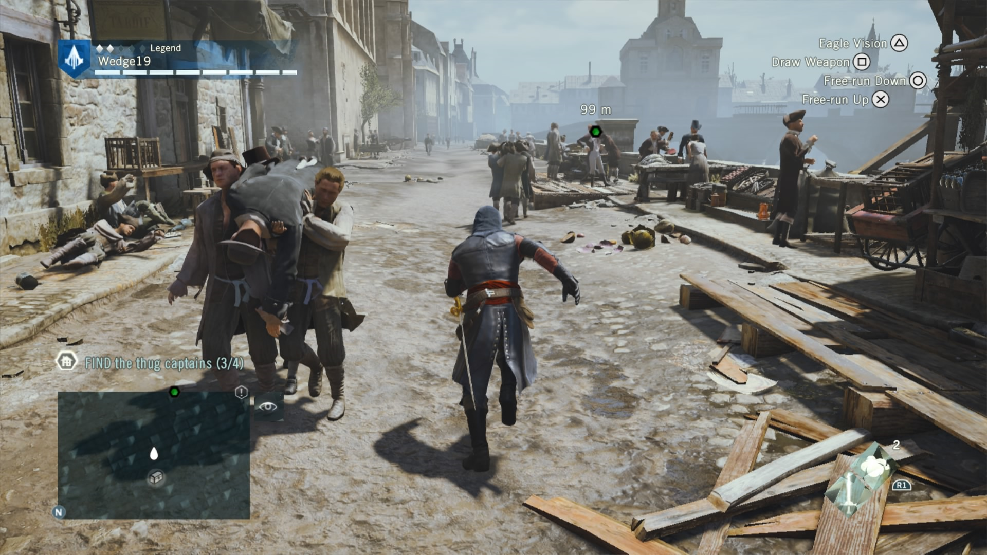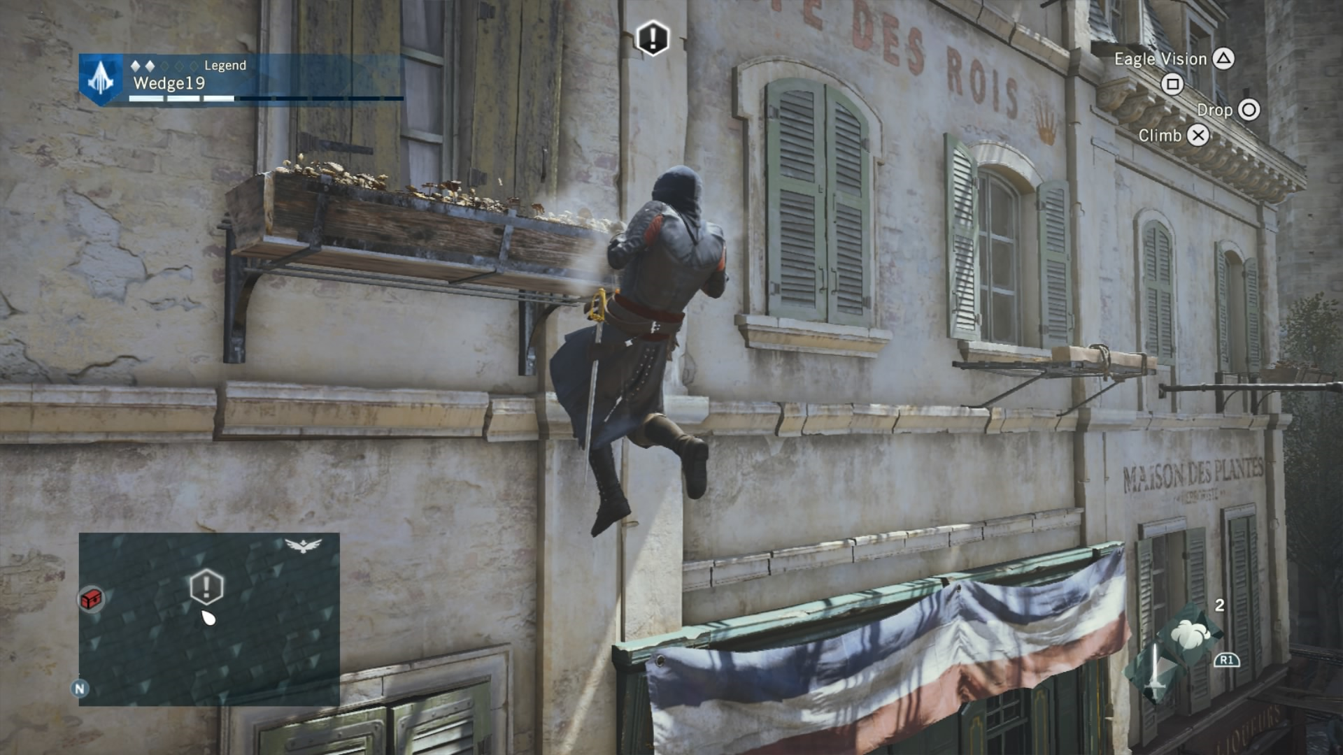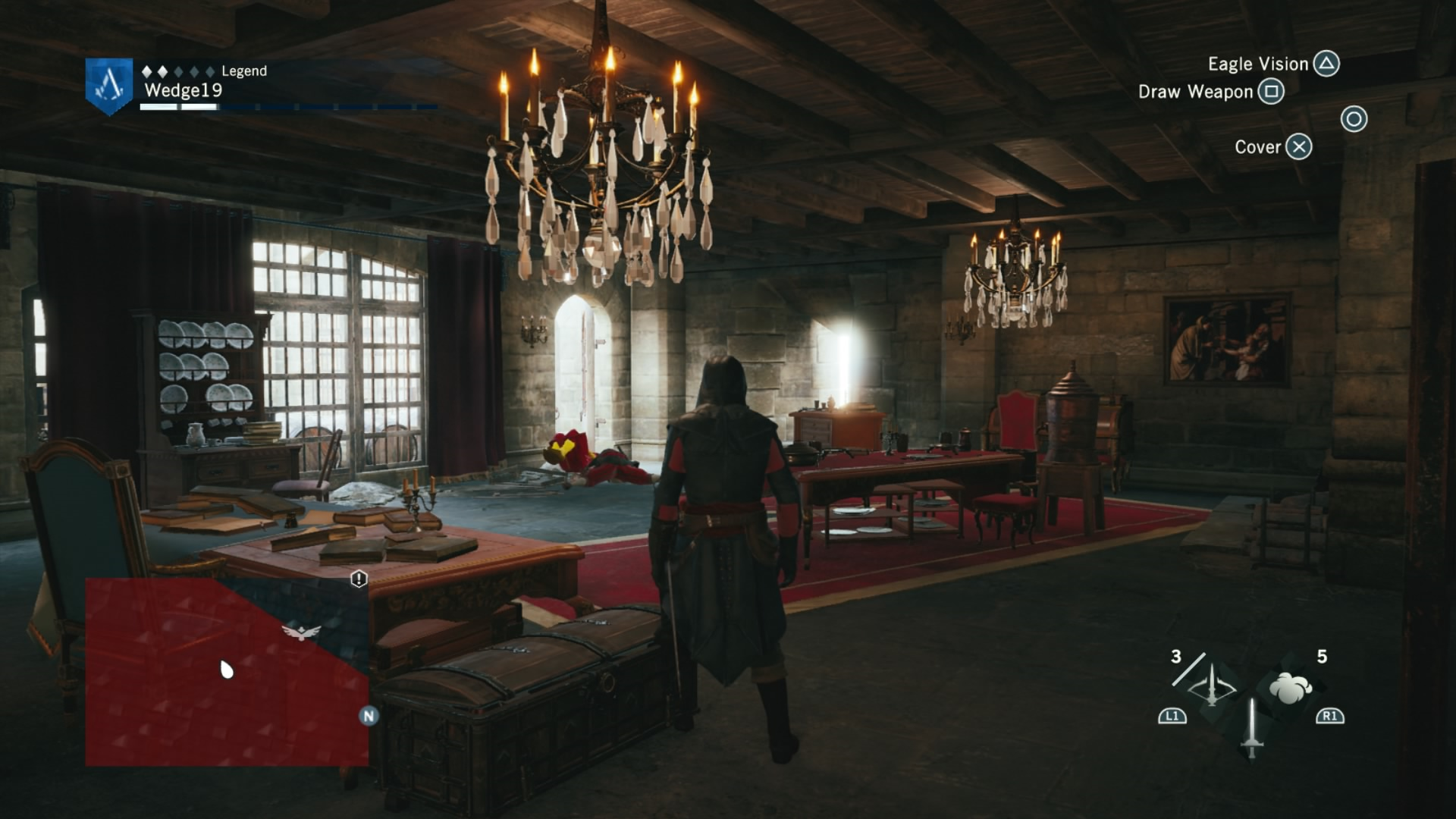 To combat this difficulty progression, Arno can be fully upgraded by buying or earning new gear, from weapons, to his hood, and even down to his pants. That’s right. Unity has customizable Assassin pants. Each of these pieces of gear give Arno a different look and different increasing stats, depending on if you prefer to focus on health for brute force, or stealth for the silent approach. If you are going for stealth, there is also a dedicated stealth button in addition to a cover system to allow Arno to bypass fights and take out enemies with a reticent hidden blade in the shadows. This seemingly basic addition drastically changes the way that Unity can be played, and allows for Arno to feel more like a true Assassin.