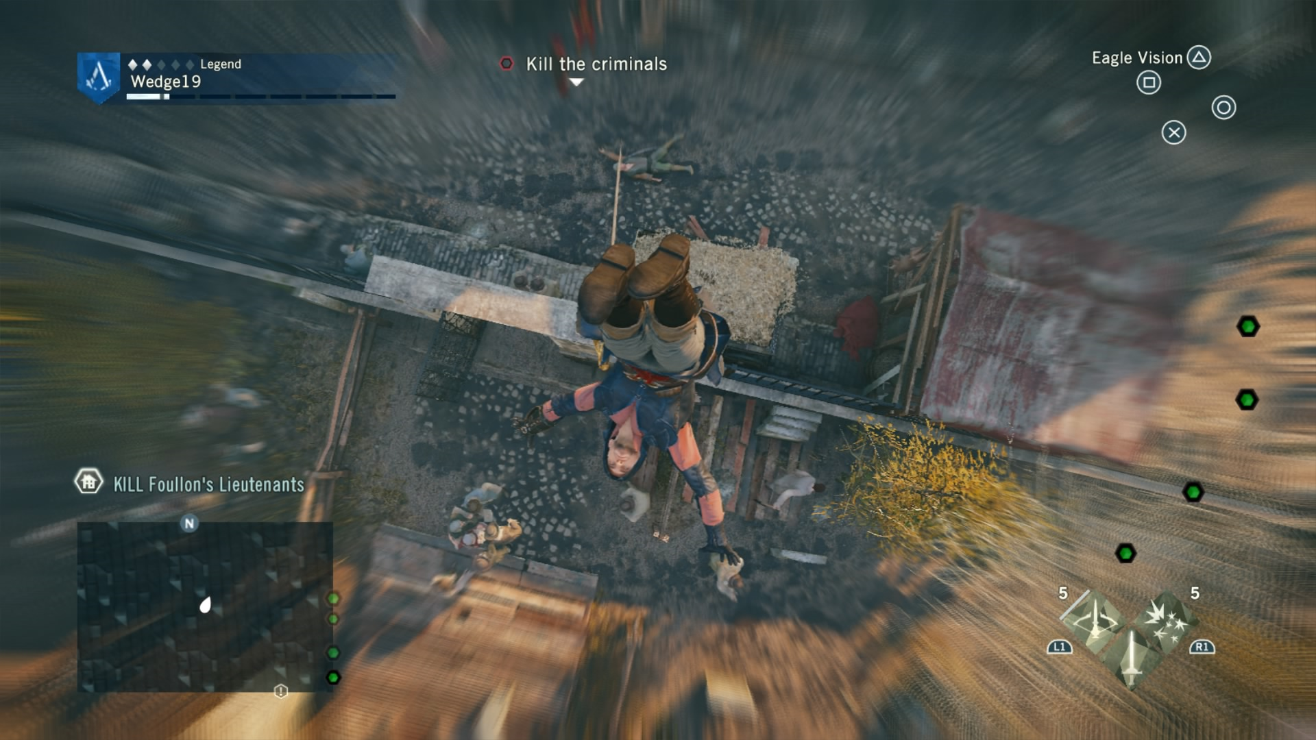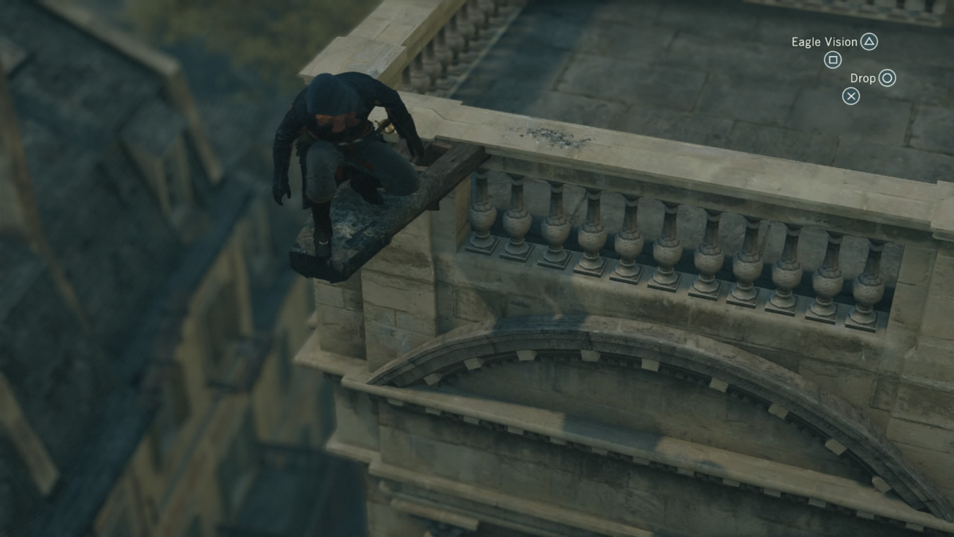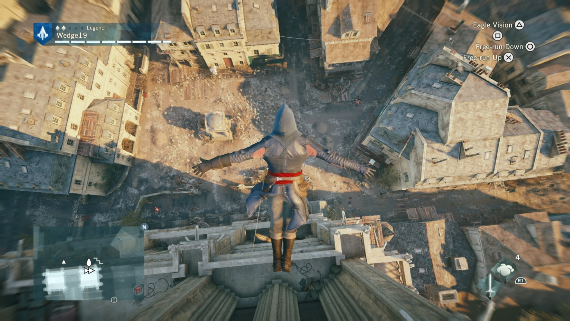 Climbing, one of the core elements of the series, has been given a bit of a makeover. Instead of only holding R2 to freerun, you can now add the cross or circle buttons to free-run upwards or downwards respectively. This means that the odd object magnetism from previous games that made you jump across to another ledge instead of down to the streets below is significantly reduced. If you want to get back down the the street, hold R2 and circle, and your free-run will direct you downward. It’s still not perfect, and will take some getting used to for veterans of the series, but this is the most control that I’ve ever felt I had over where my assassin is going, not to mention that climbing down things is now immensely faster than before.