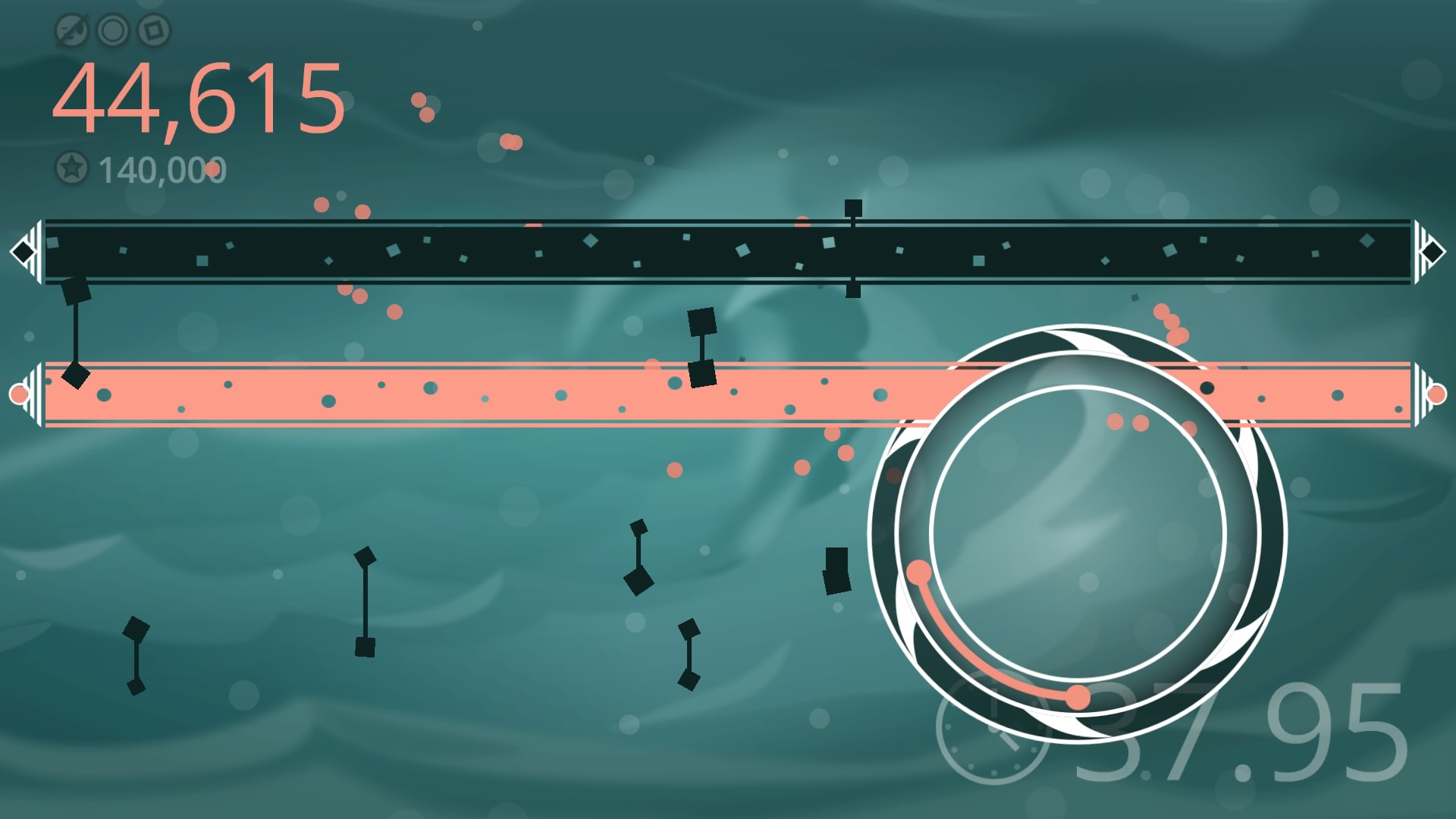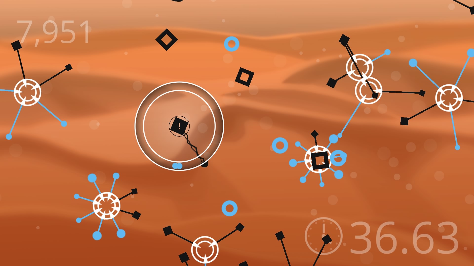 Minutes throws away one of the core fundamentals of a shooter – the actual shooting. The game instead has players focus on evasion and setting a high score. In order to achieve a score that will complete a level, the player must control a circle around the map to absorb colored objects while avoiding black objects. If the circle hits a black object a meter within the circle starts to fill up. This will eventually lead to a fail screen if it fills up completely. Each level in the game only lasts one minute which means the game operates at a fast pace and failing a level won’t set back your progress at all.