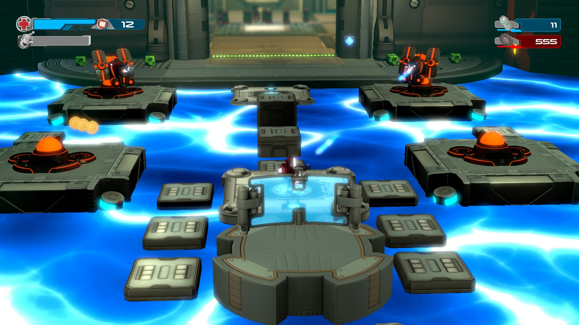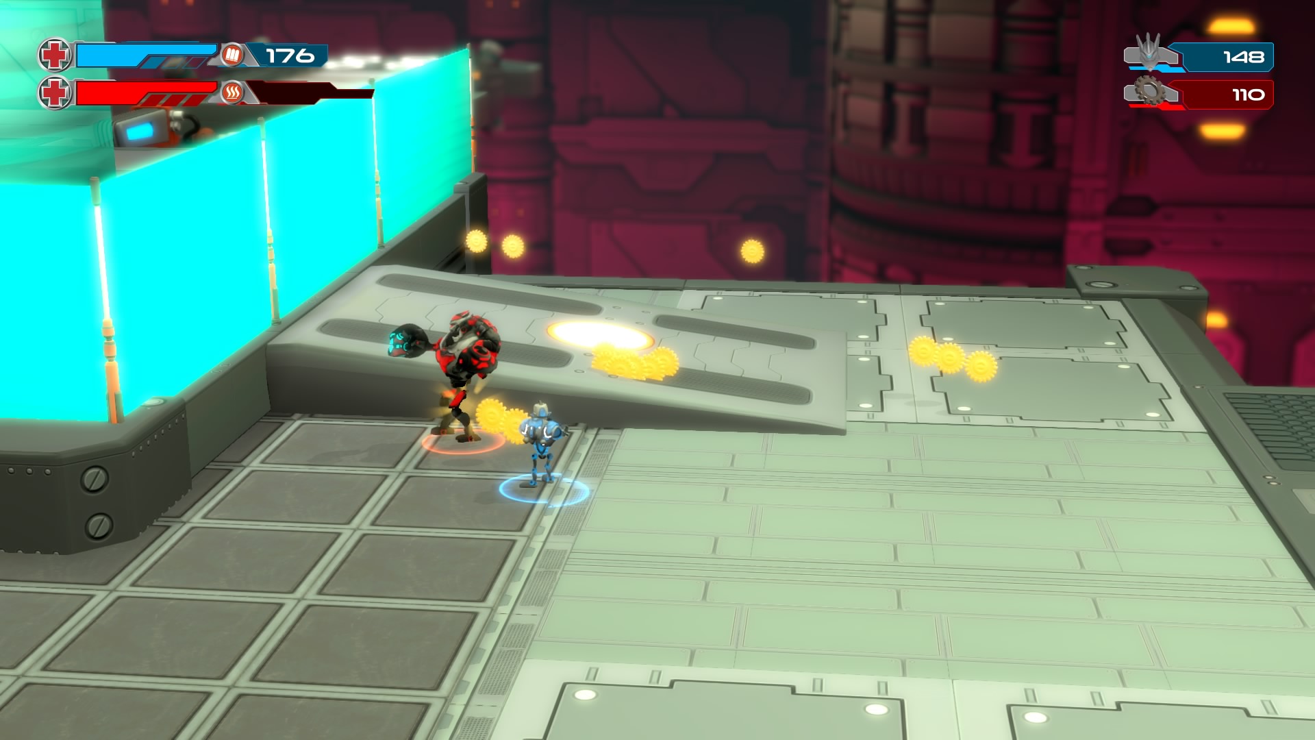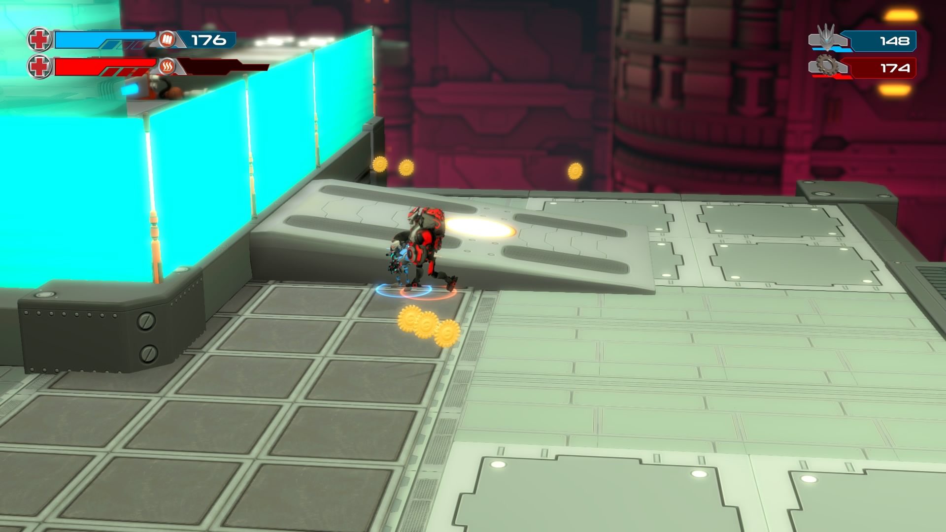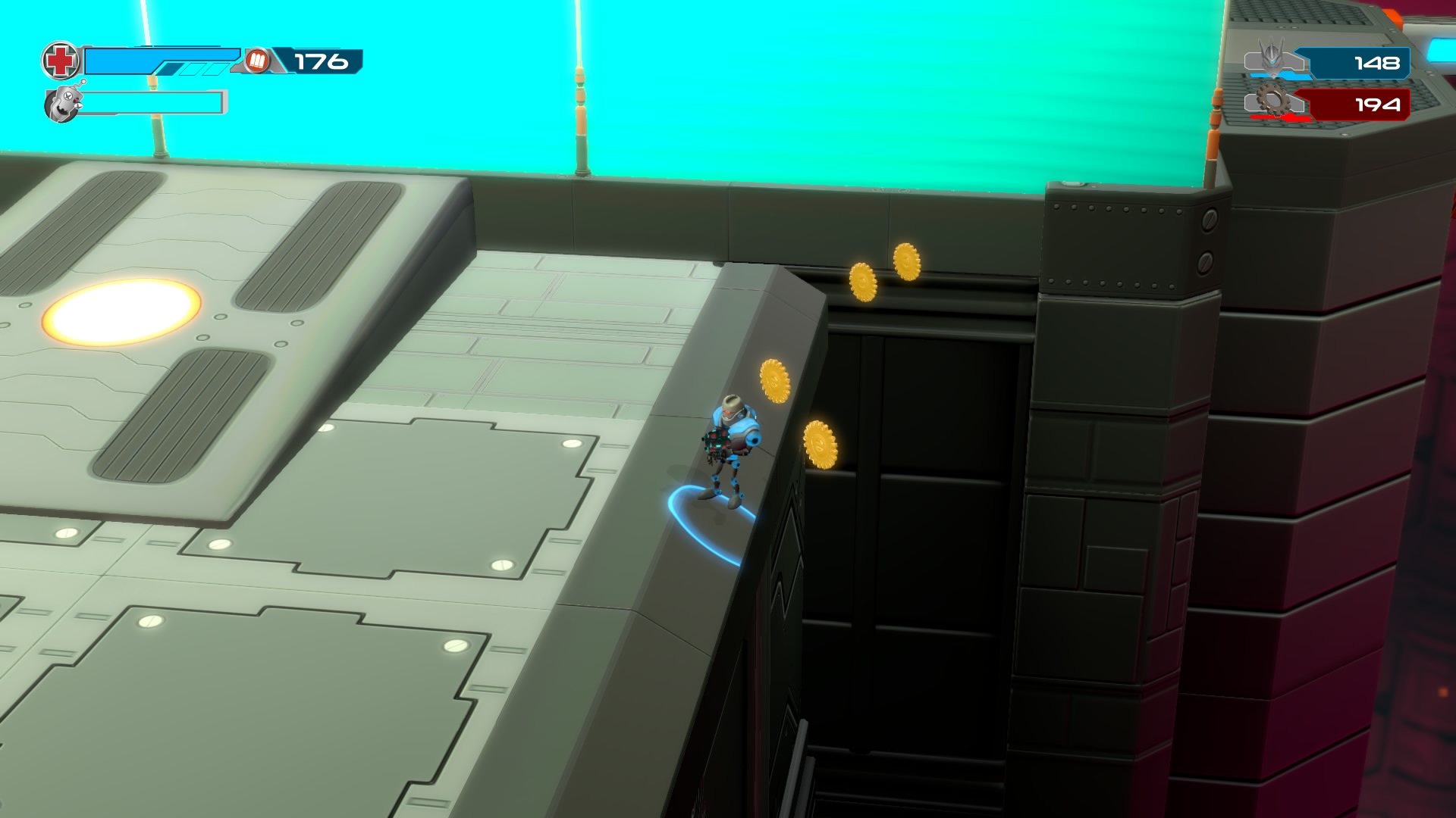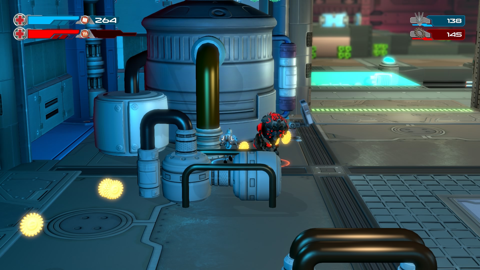 Gameplay consists of basic platforming in an isometric viewpoint. You use the left stick to move, and the right stick to target an enemy. R2 fires, and square melees. It’s pretty awkward, because aiming is not particularly precise and your character only moves in eight directions. I think Yorbie would have benefited from being a twin-stick shooter instead of what we got. There’s light platforming, but the camera angle is your enemy here, and you can expect to leap off edges on accident and not seeing platforms entirely. You can collect cogwheel-shaped coins and energy tubes to upgrade your weapons, which can help to clear out rooms more quickly and with fewer deaths.