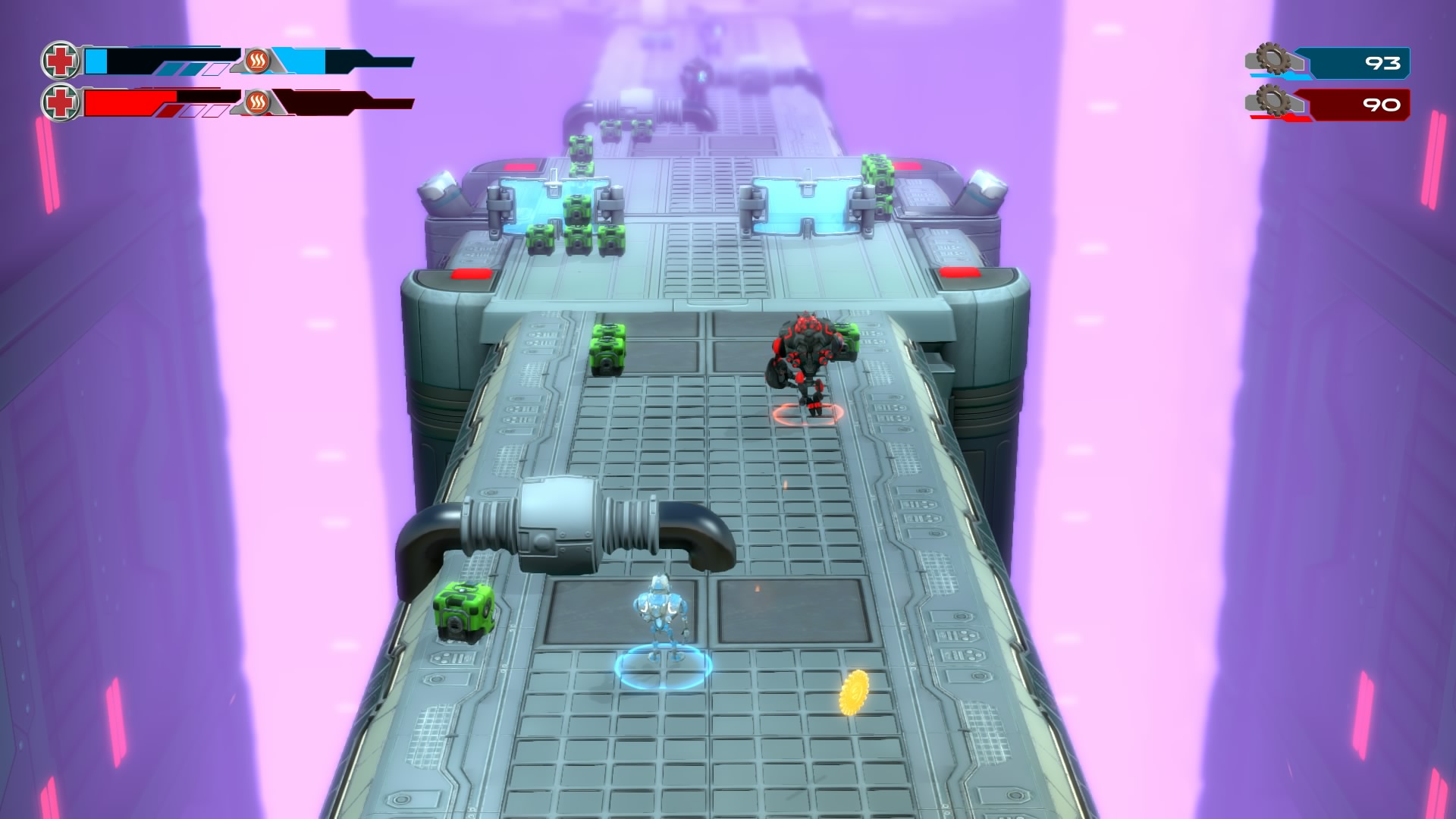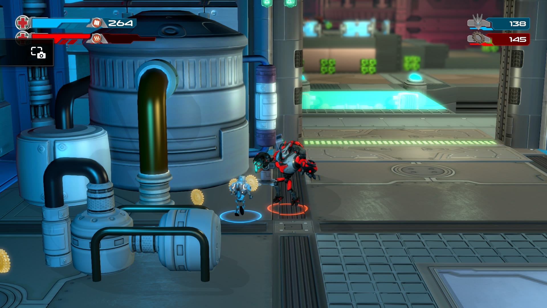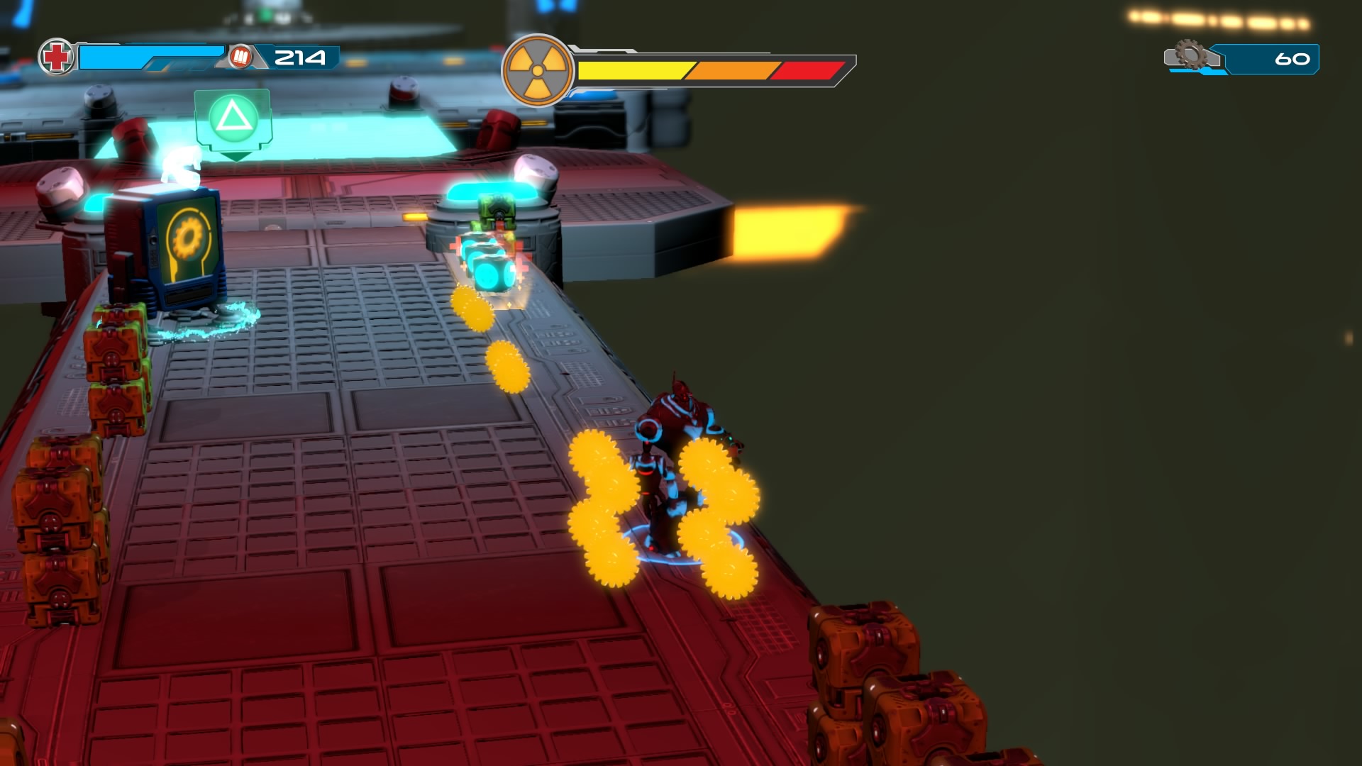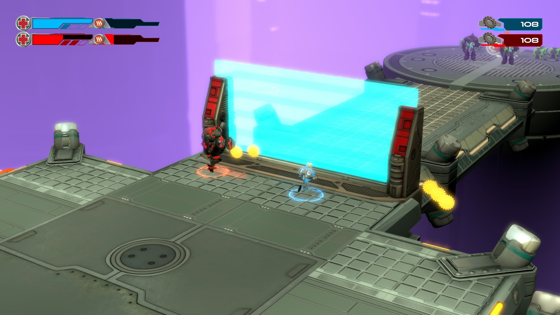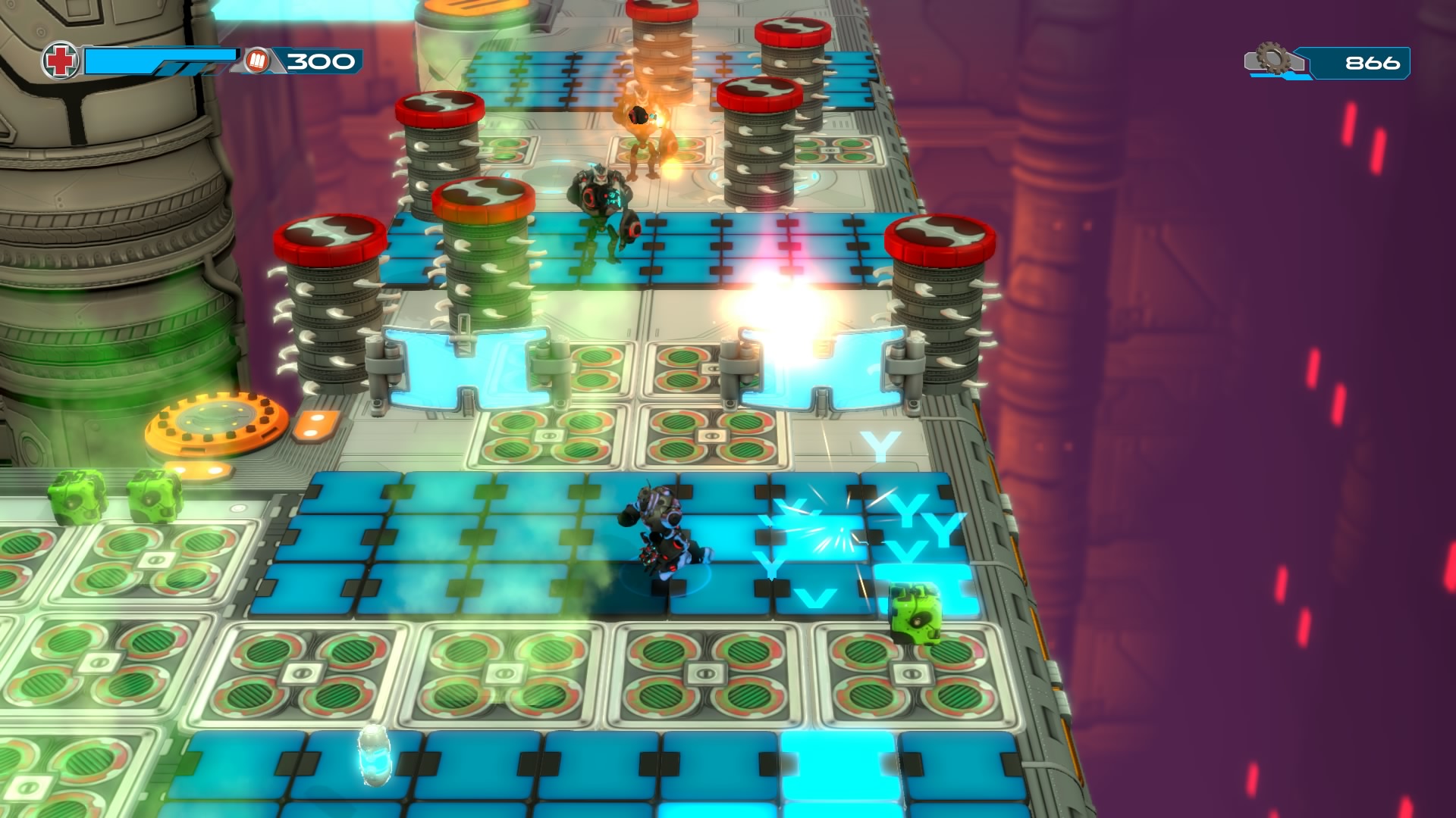 Gameplay consists of basic platforming in an isometric viewpoint. You use the left stick to move, and the right stick to target an enemy. R2 fires, and square melees. It’s pretty awkward, because aiming is not particularly precise and your character only moves in eight directions. I think Yorbie would have benefited from being a twin-stick shooter instead of what we got. There’s light platforming, but the camera angle is your enemy here, and you can expect to leap off edges on accident and not seeing platforms entirely. You can collect cogwheel-shaped coins and energy tubes to upgrade your weapons, which can help to clear out rooms more quickly and with fewer deaths.