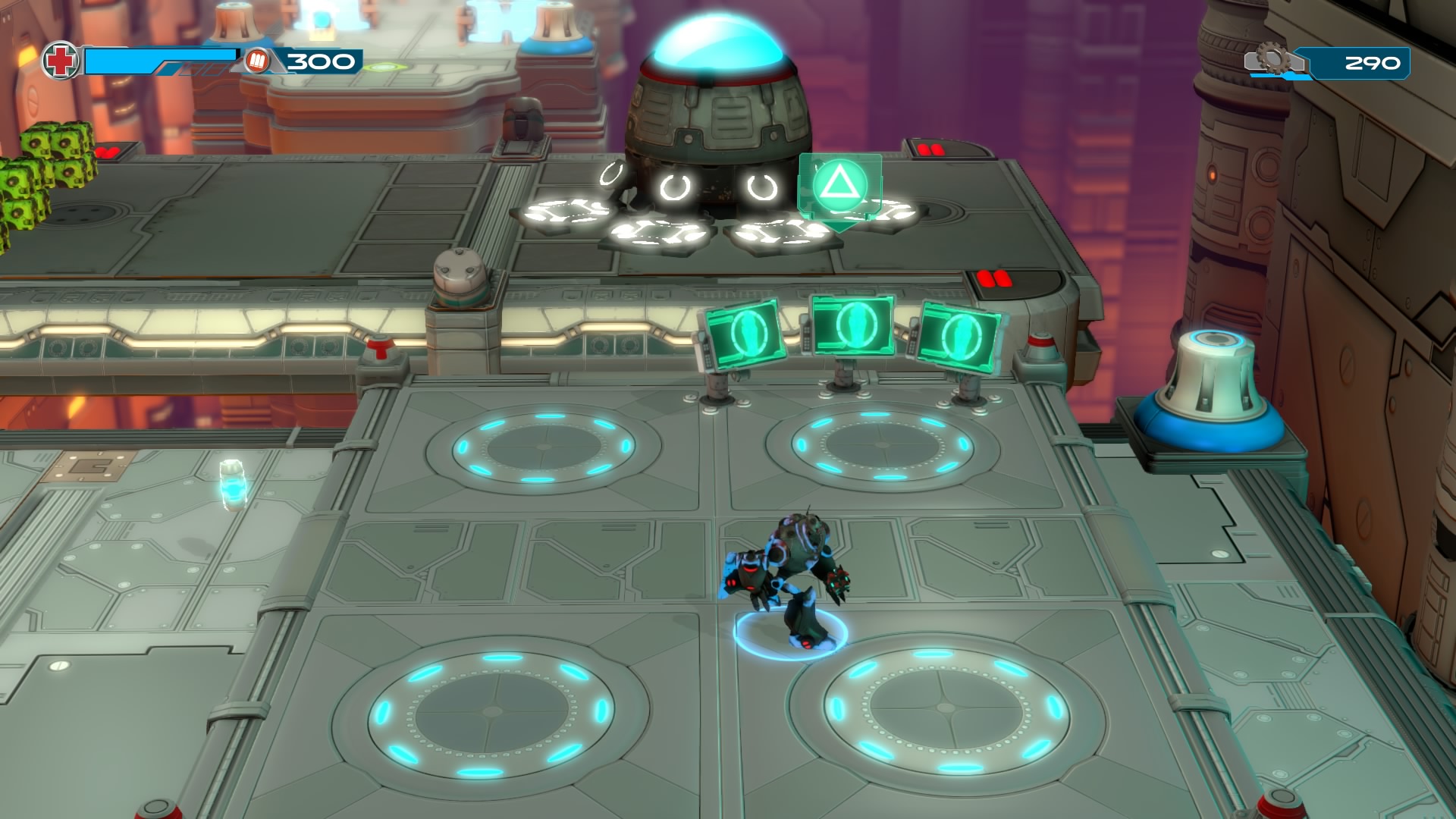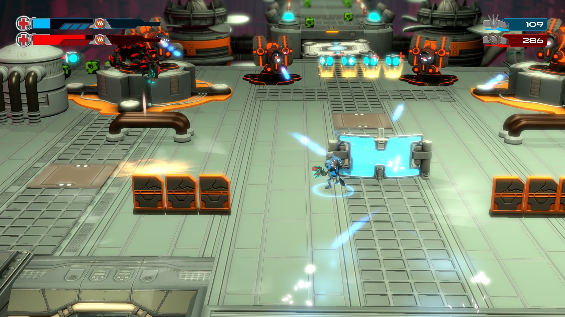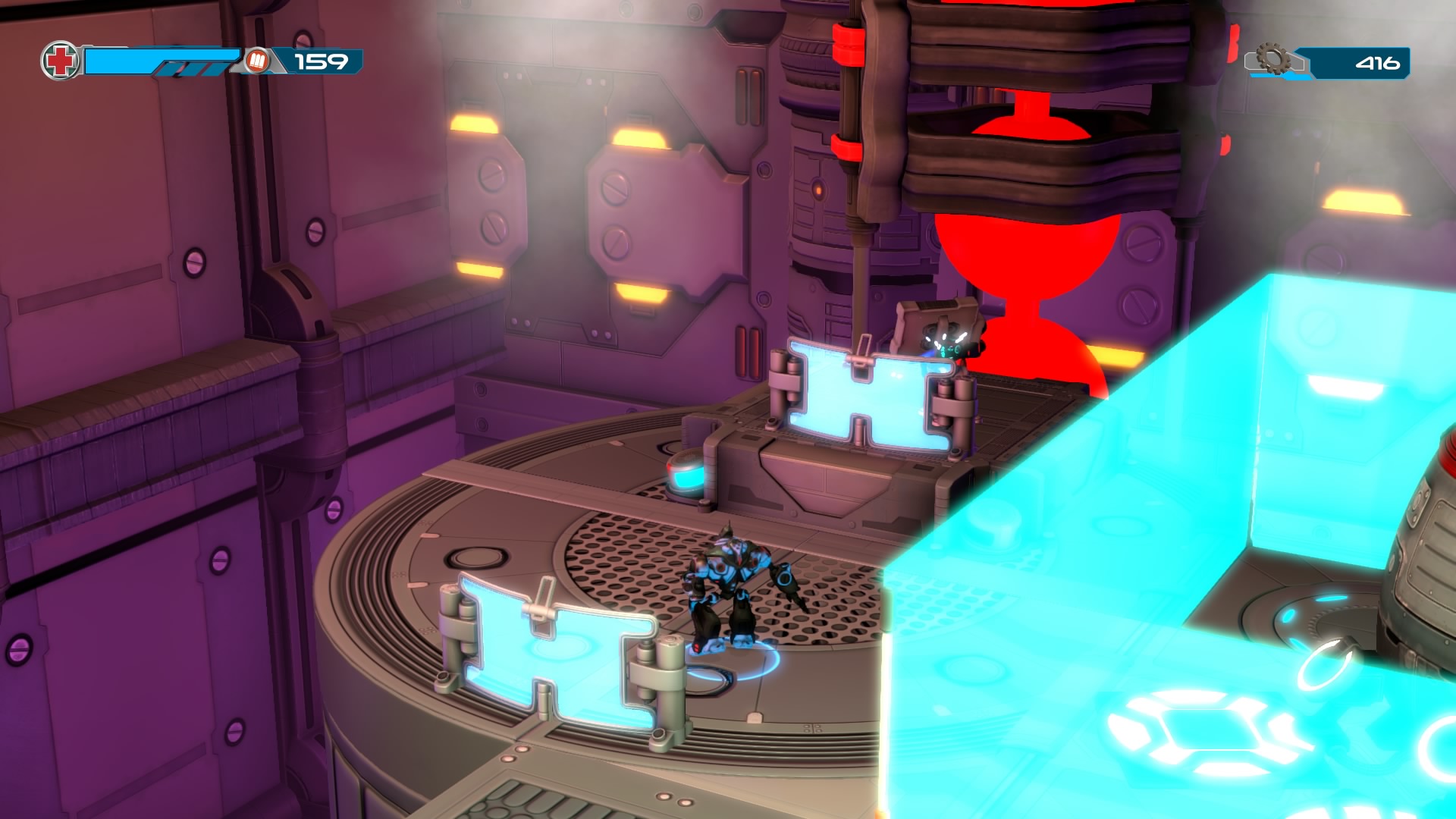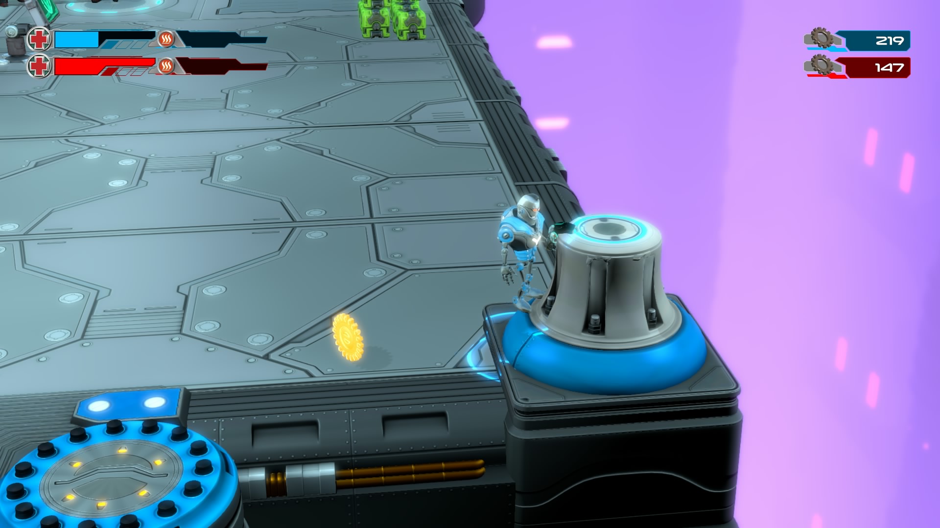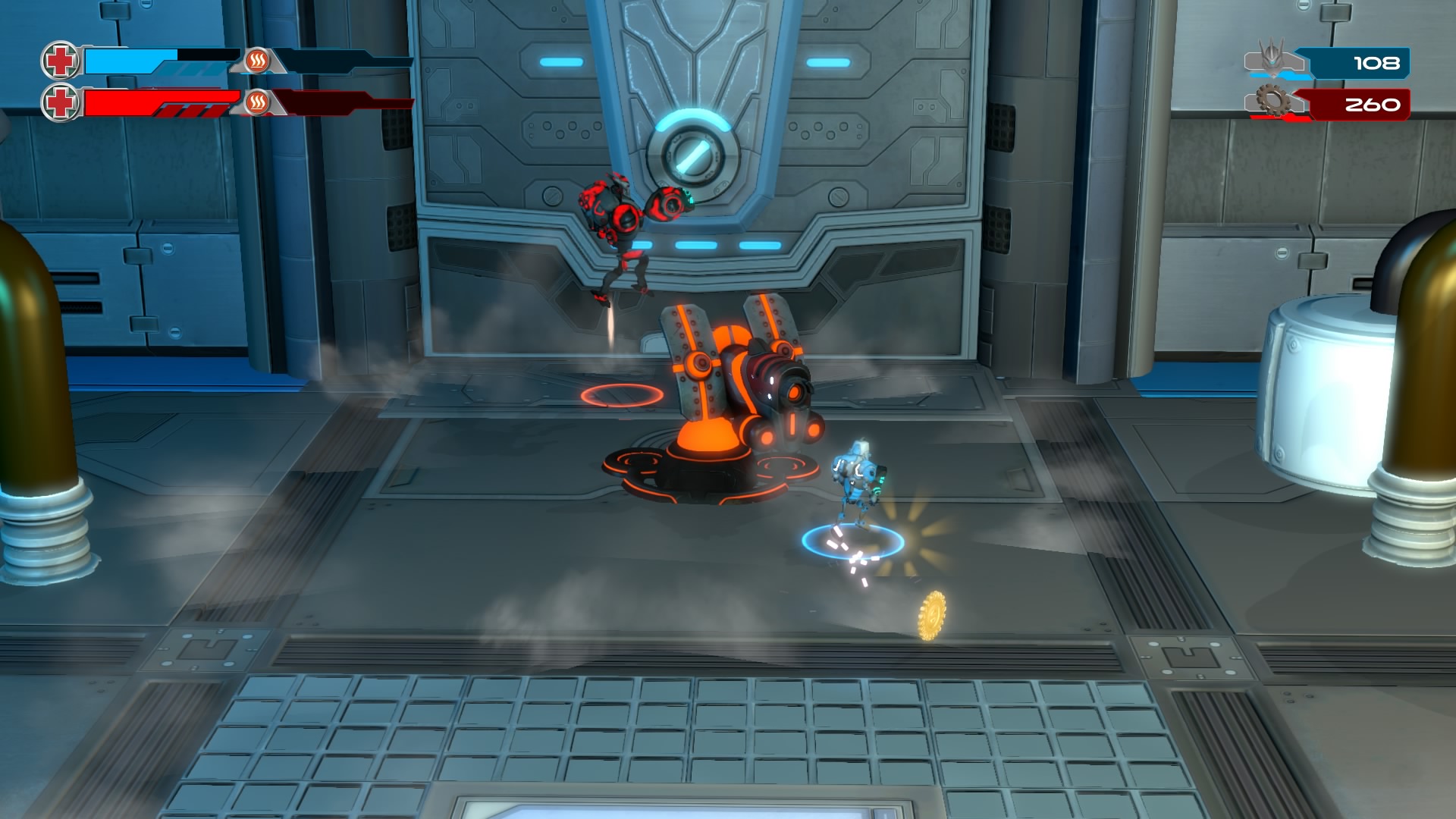 Gameplay consists of basic platforming in an isometric viewpoint. You use the left stick to move, and the right stick to target an enemy. R2 fires, and square melees. It’s pretty awkward, because aiming is not particularly precise and your character only moves in eight directions. I think Yorbie would have benefited from being a twin-stick shooter instead of what we got. There’s light platforming, but the camera angle is your enemy here, and you can expect to leap off edges on accident and not seeing platforms entirely. You can collect cogwheel-shaped coins and energy tubes to upgrade your weapons, which can help to clear out rooms more quickly and with fewer deaths.