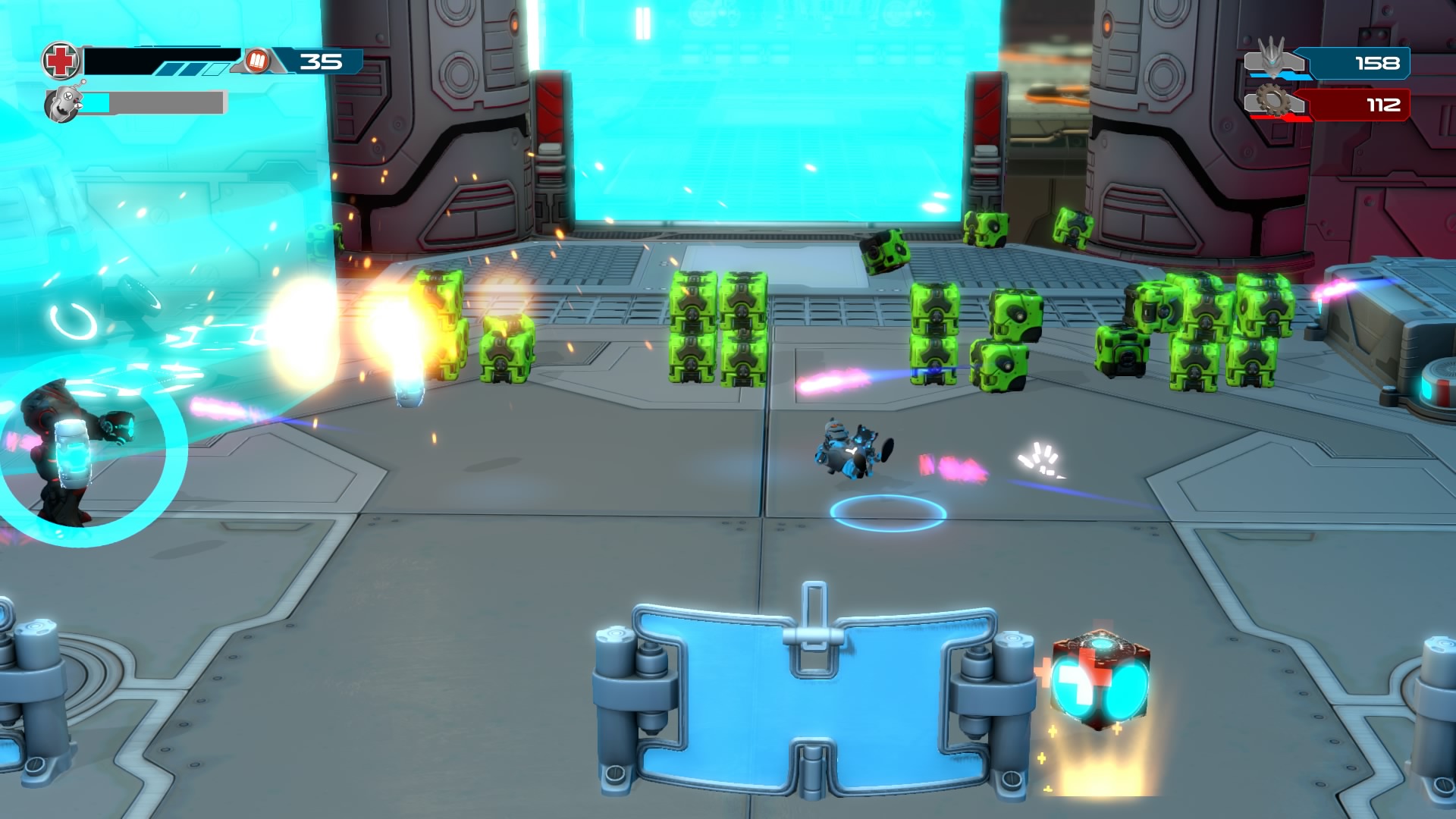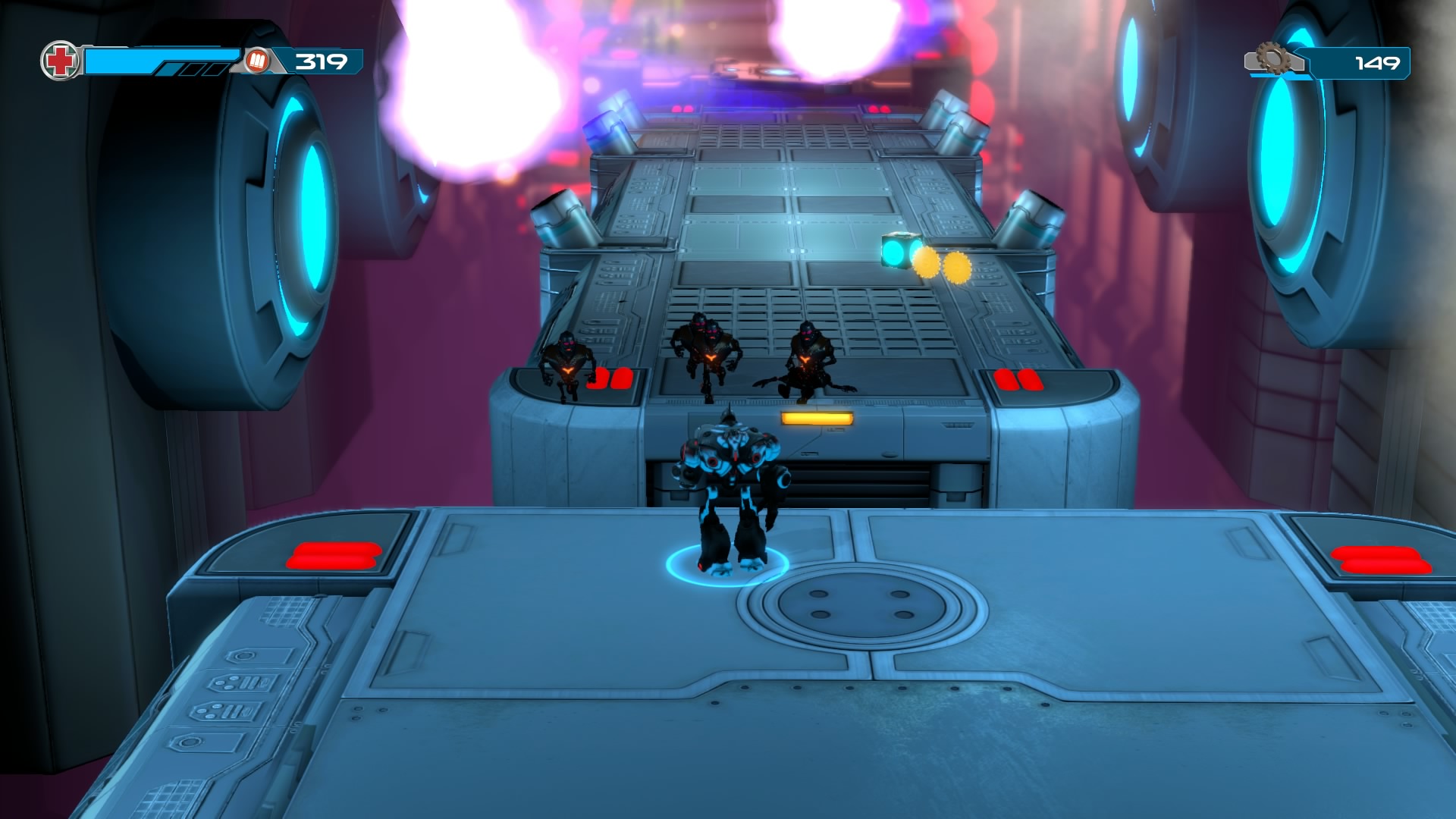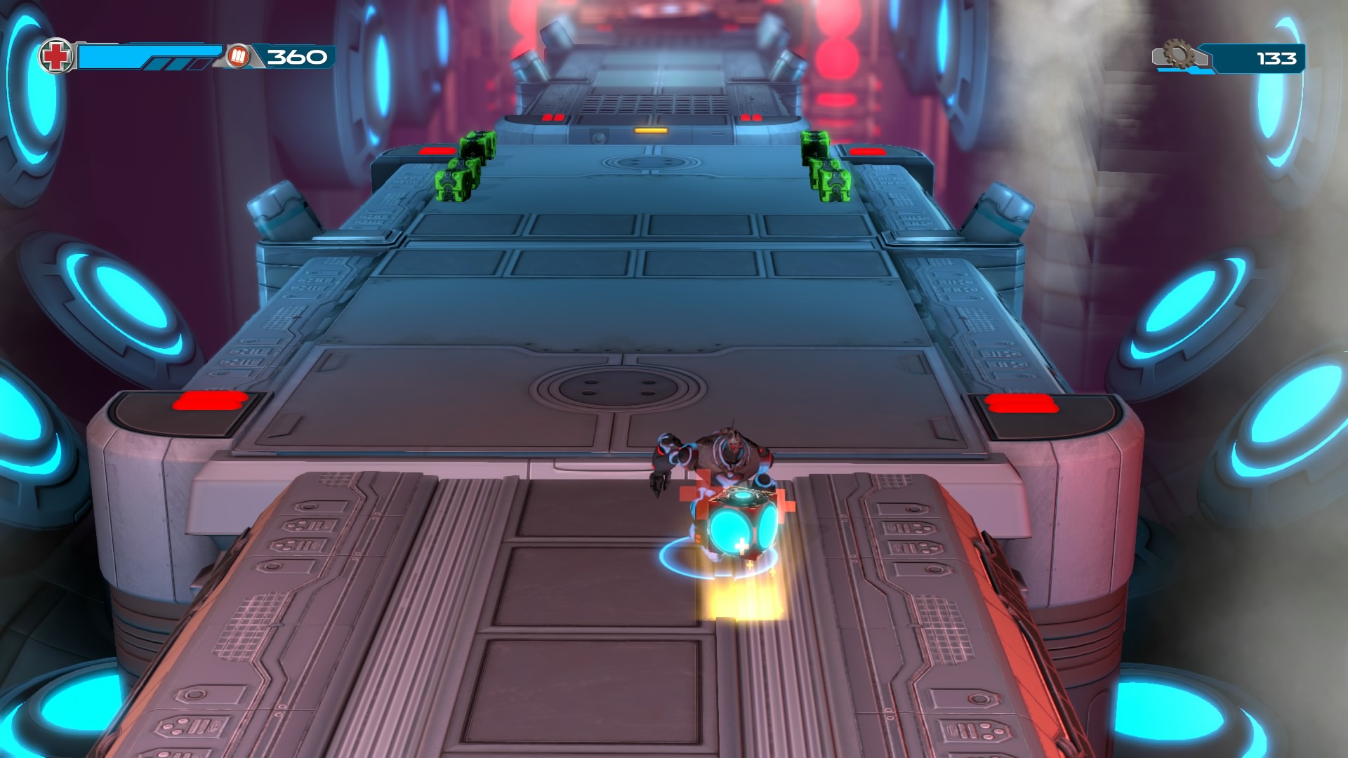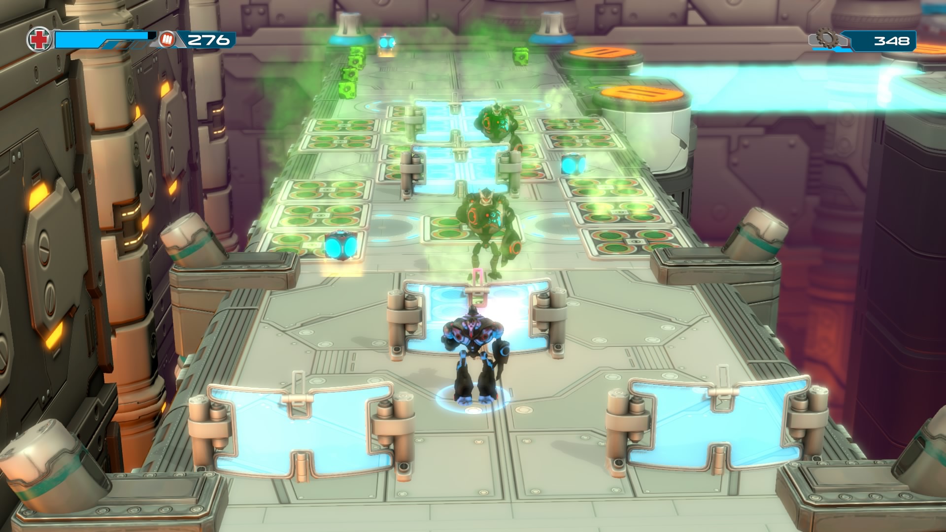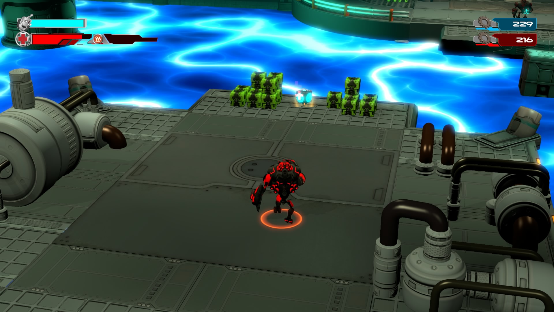 Gameplay consists of basic platforming in an isometric viewpoint. You use the left stick to move, and the right stick to target an enemy. R2 fires, and square melees. It’s pretty awkward, because aiming is not particularly precise and your character only moves in eight directions. I think Yorbie would have benefited from being a twin-stick shooter instead of what we got. There’s light platforming, but the camera angle is your enemy here, and you can expect to leap off edges on accident and not seeing platforms entirely. You can collect cogwheel-shaped coins and energy tubes to upgrade your weapons, which can help to clear out rooms more quickly and with fewer deaths.