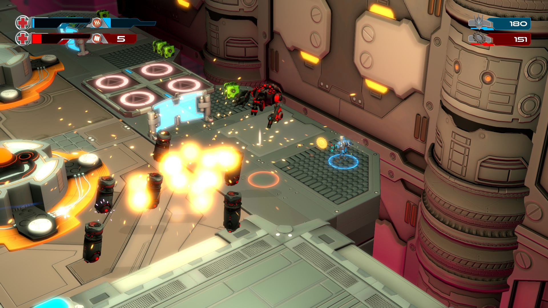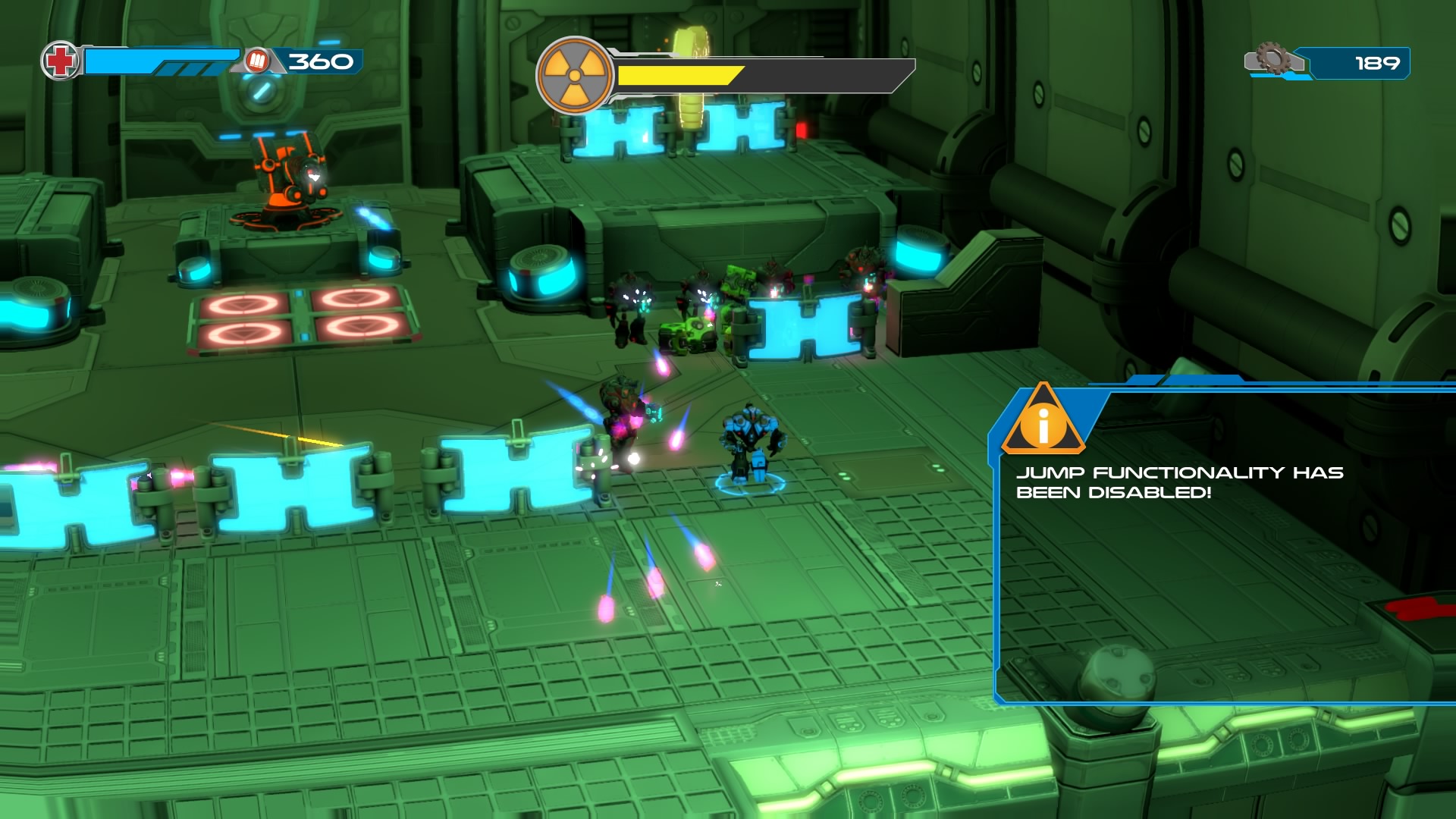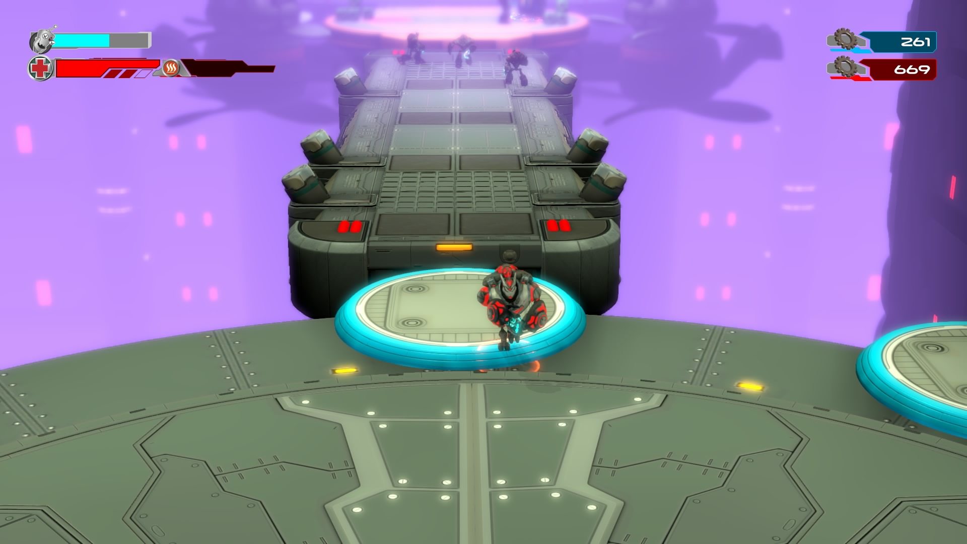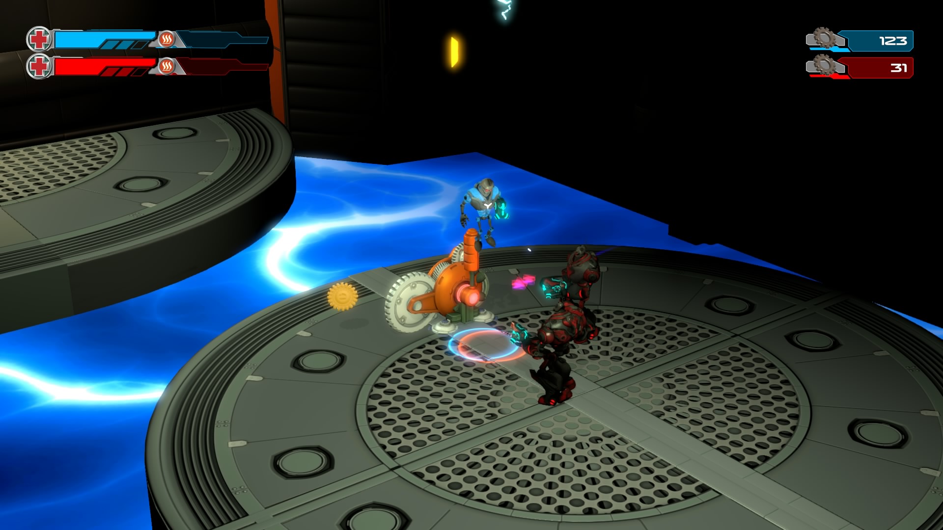 Gameplay consists of basic platforming in an isometric viewpoint. You use the left stick to move, and the right stick to target an enemy. R2 fires, and square melees. It’s pretty awkward, because aiming is not particularly precise and your character only moves in eight directions. I think Yorbie would have benefited from being a twin-stick shooter instead of what we got. There’s light platforming, but the camera angle is your enemy here, and you can expect to leap off edges on accident and not seeing platforms entirely. You can collect cogwheel-shaped coins and energy tubes to upgrade your weapons, which can help to clear out rooms more quickly and with fewer deaths.