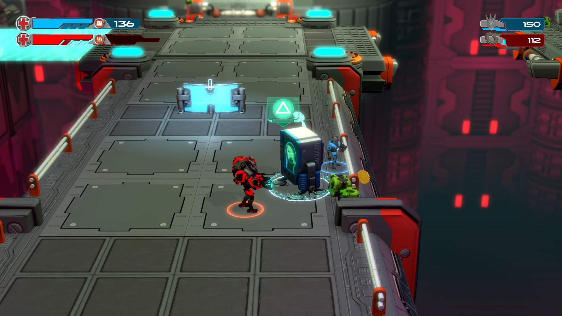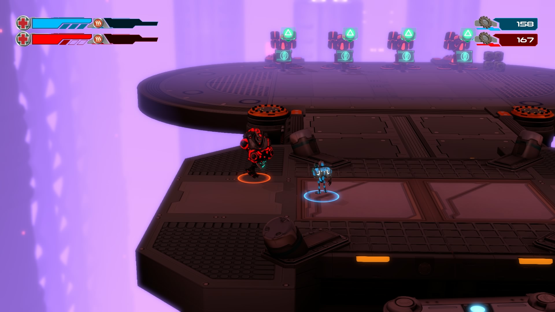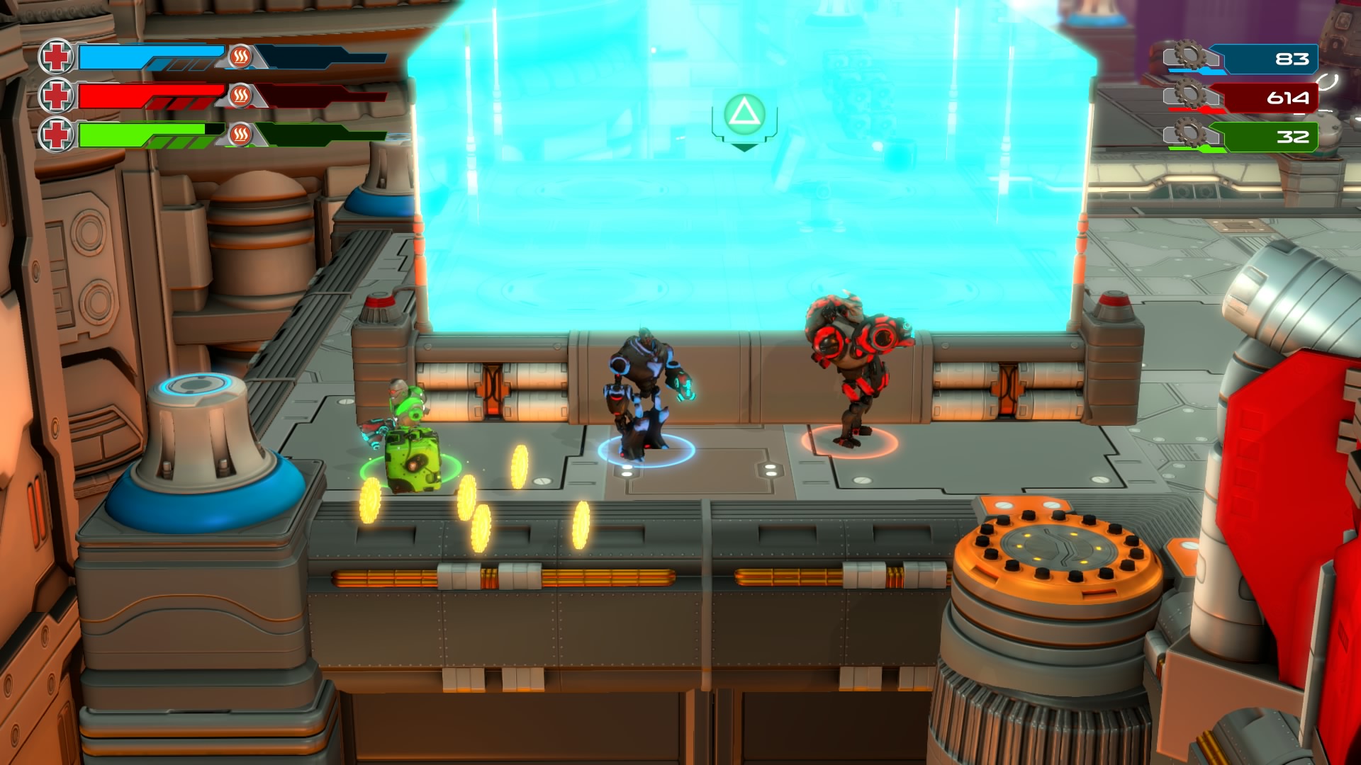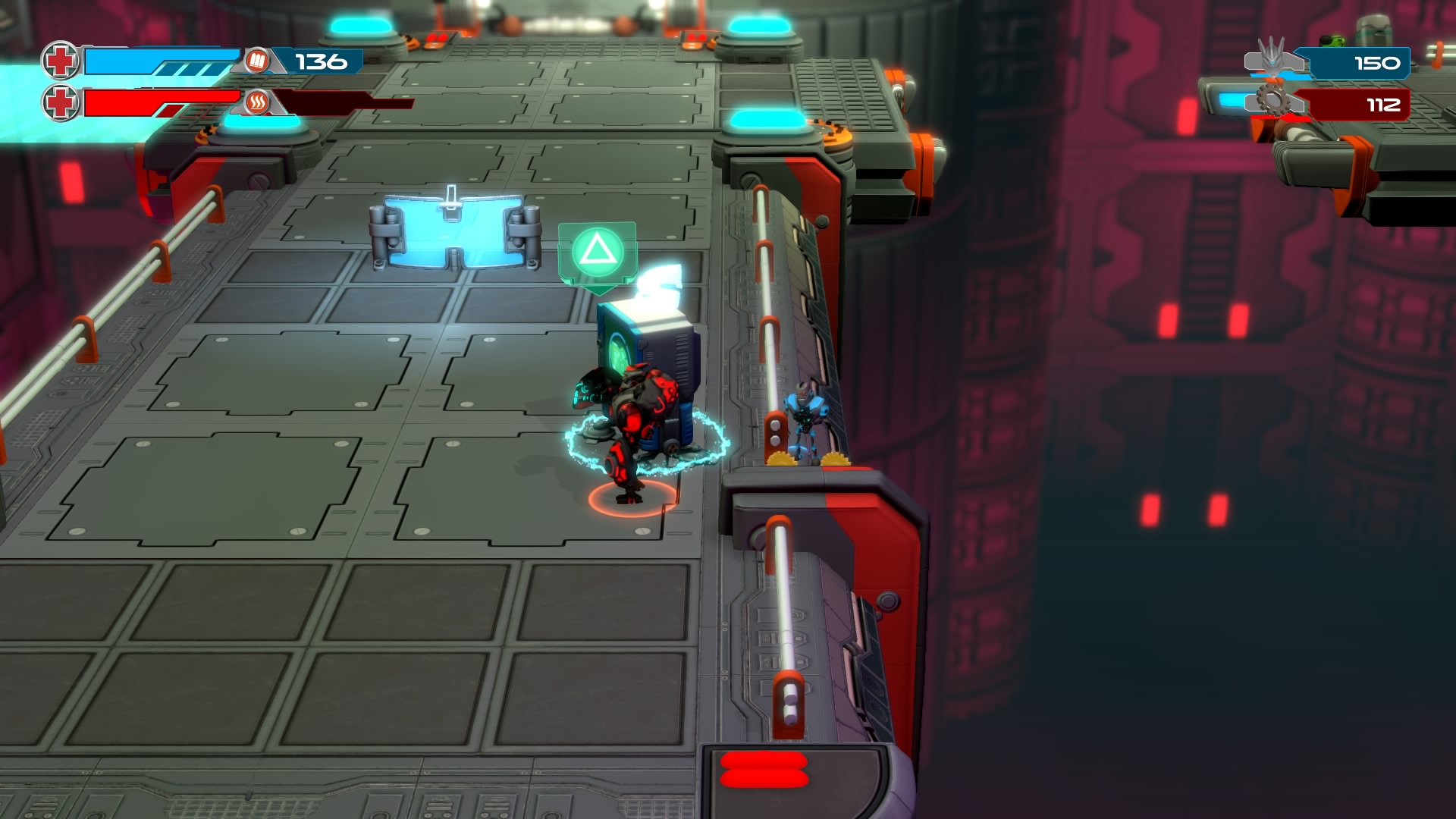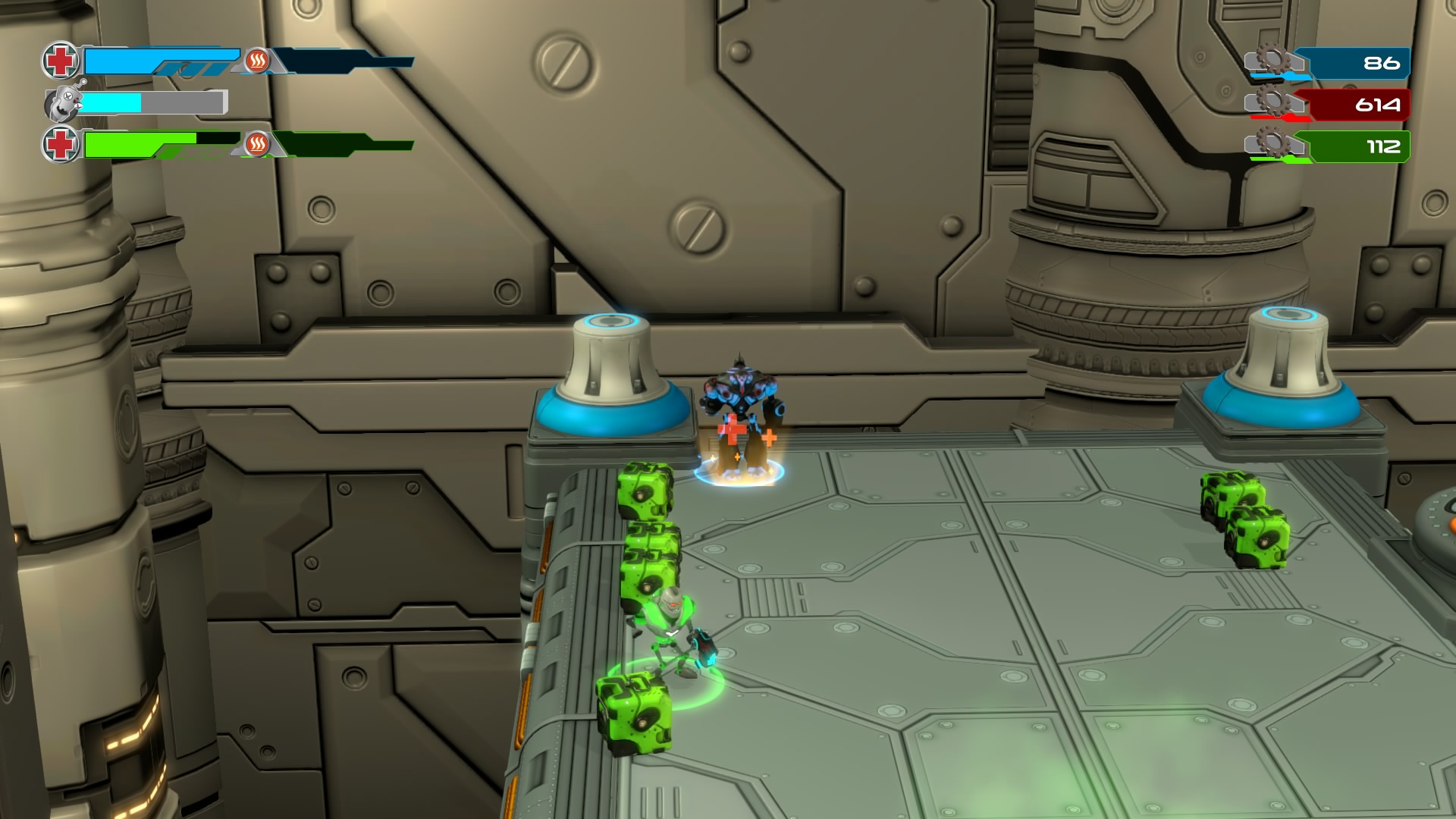 Gameplay consists of basic platforming in an isometric viewpoint. You use the left stick to move, and the right stick to target an enemy. R2 fires, and square melees. It’s pretty awkward, because aiming is not particularly precise and your character only moves in eight directions. I think Yorbie would have benefited from being a twin-stick shooter instead of what we got. There’s light platforming, but the camera angle is your enemy here, and you can expect to leap off edges on accident and not seeing platforms entirely. You can collect cogwheel-shaped coins and energy tubes to upgrade your weapons, which can help to clear out rooms more quickly and with fewer deaths.