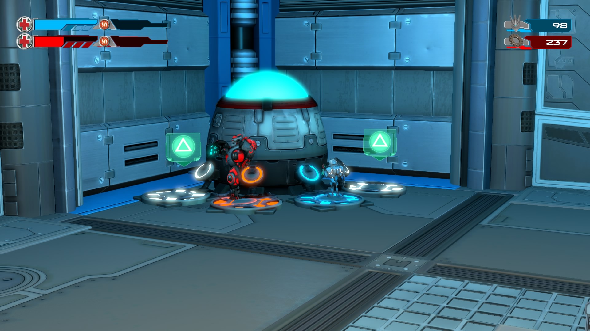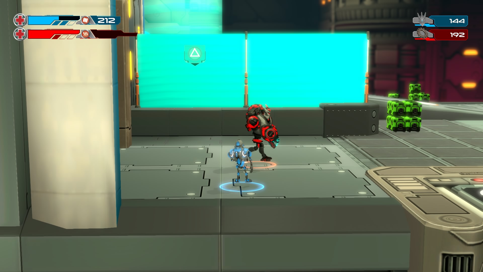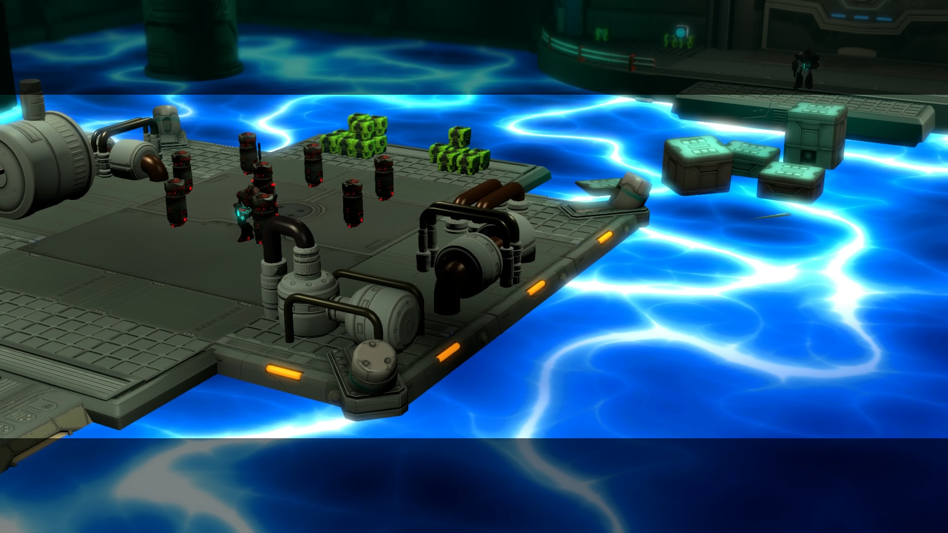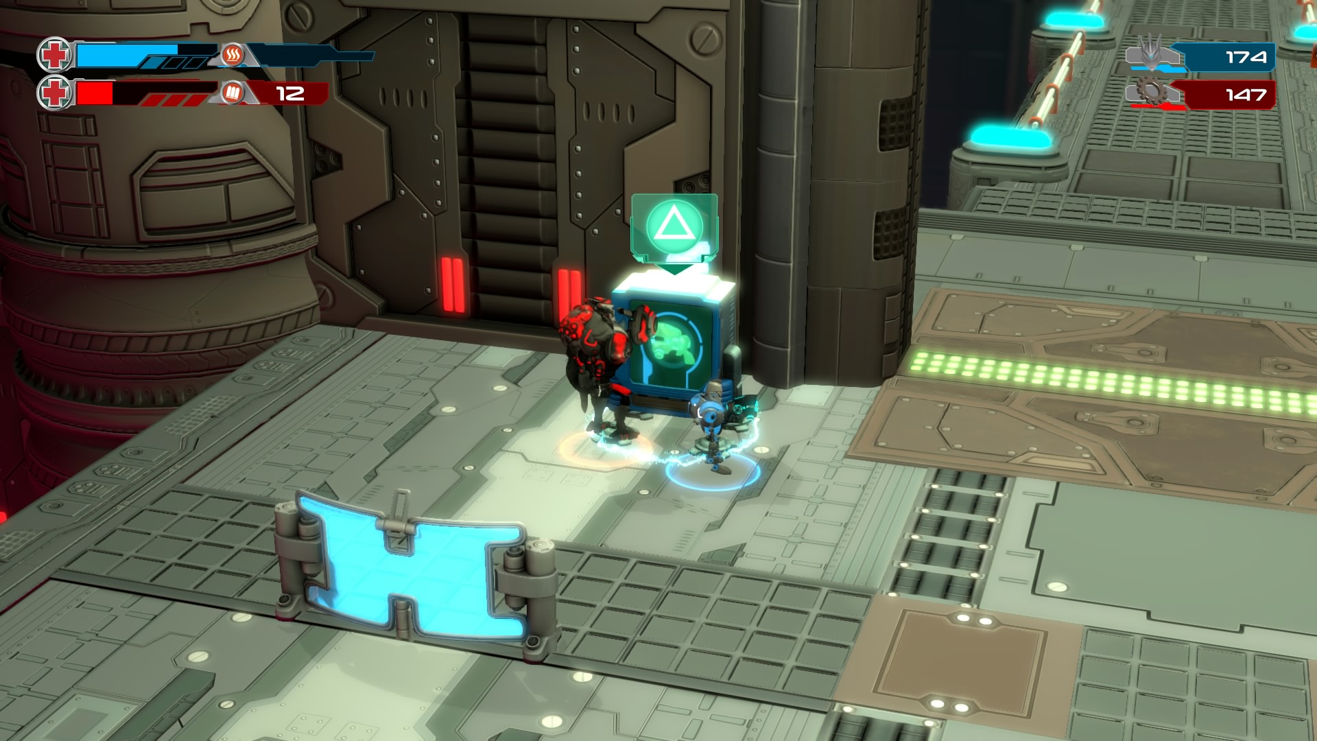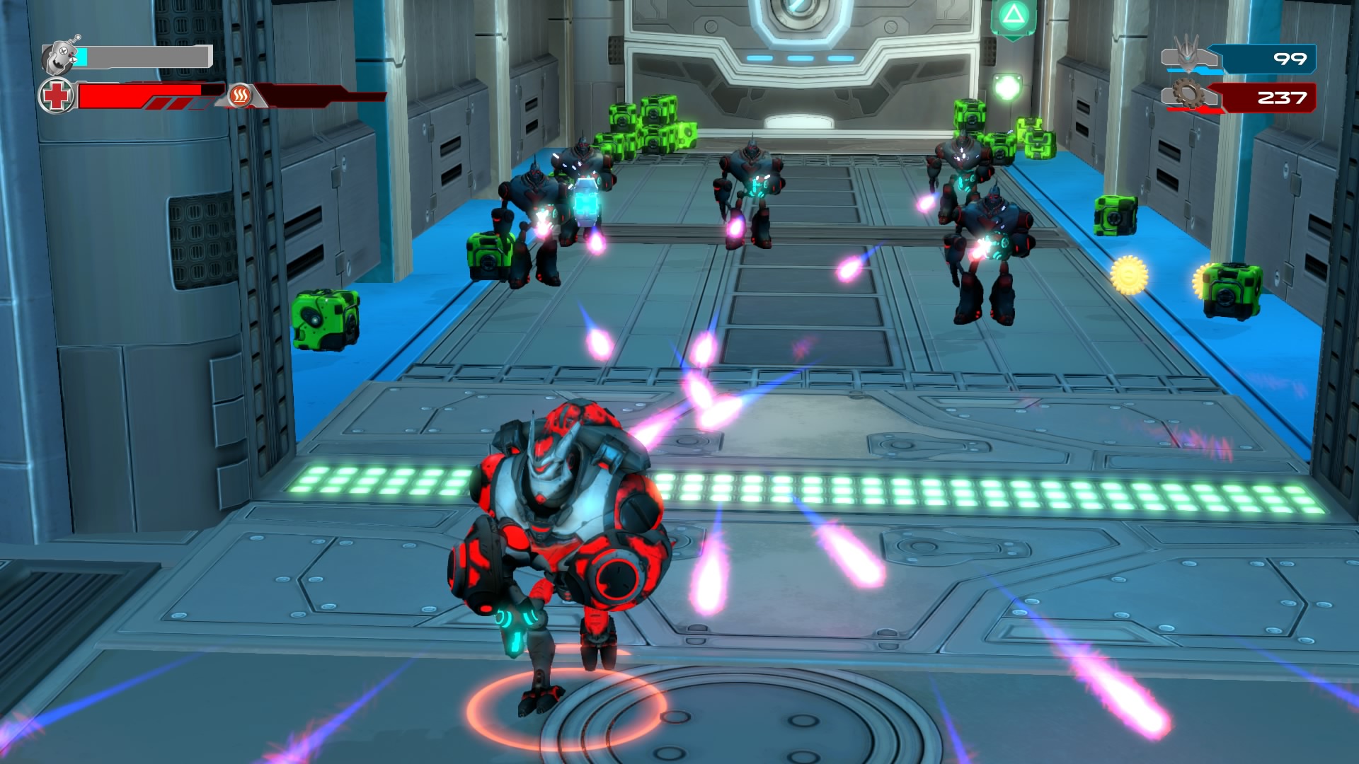 Gameplay consists of basic platforming in an isometric viewpoint. You use the left stick to move, and the right stick to target an enemy. R2 fires, and square melees. It’s pretty awkward, because aiming is not particularly precise and your character only moves in eight directions. I think Yorbie would have benefited from being a twin-stick shooter instead of what we got. There’s light platforming, but the camera angle is your enemy here, and you can expect to leap off edges on accident and not seeing platforms entirely. You can collect cogwheel-shaped coins and energy tubes to upgrade your weapons, which can help to clear out rooms more quickly and with fewer deaths.