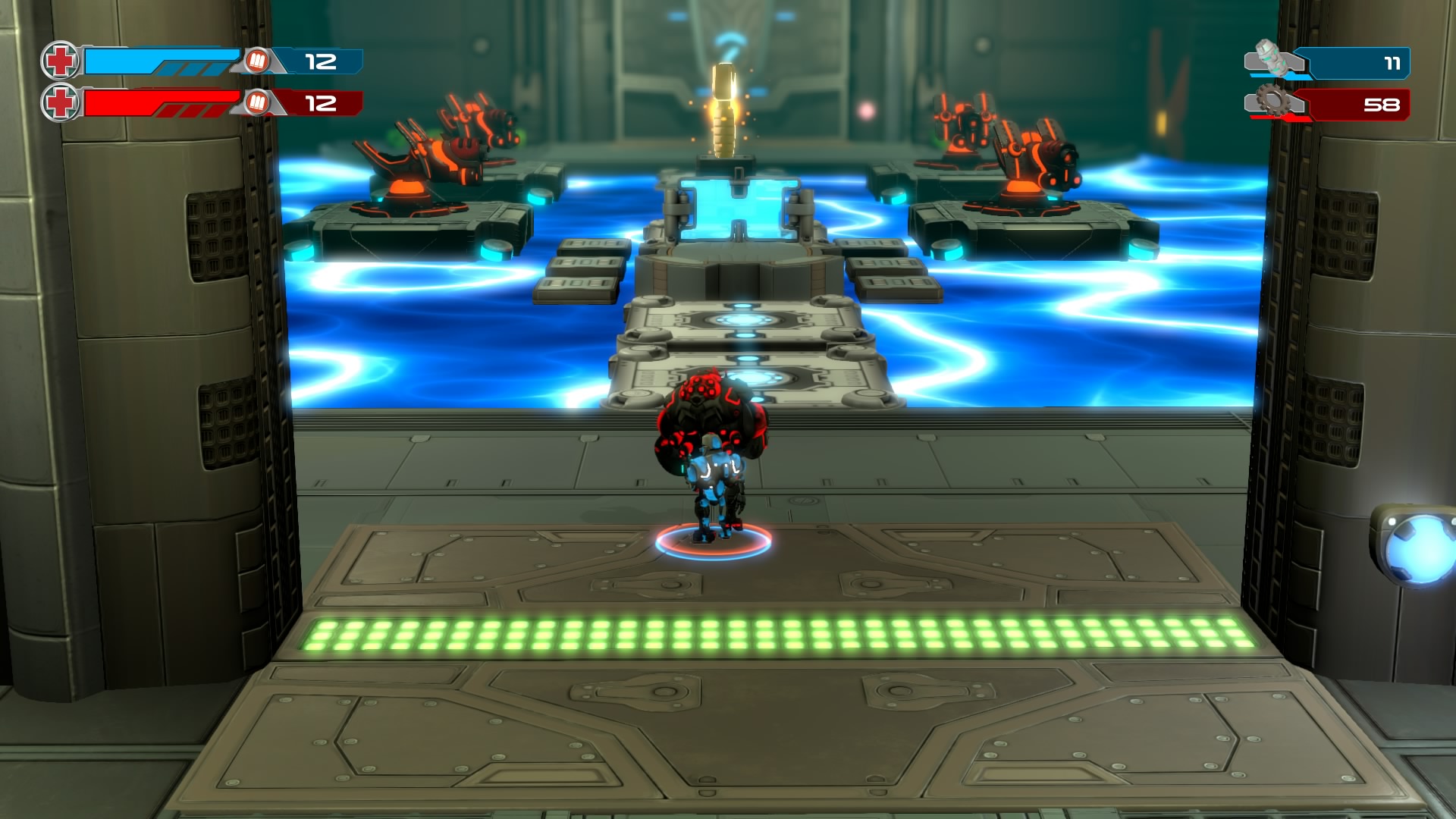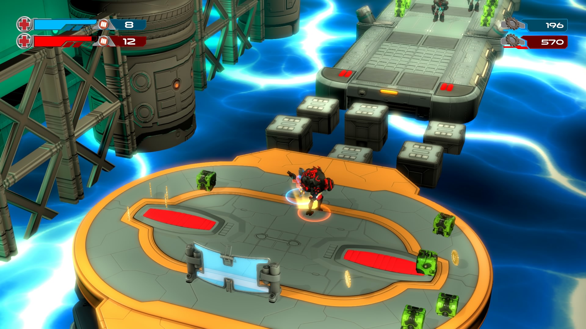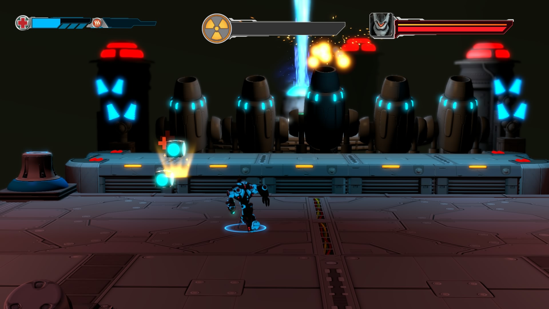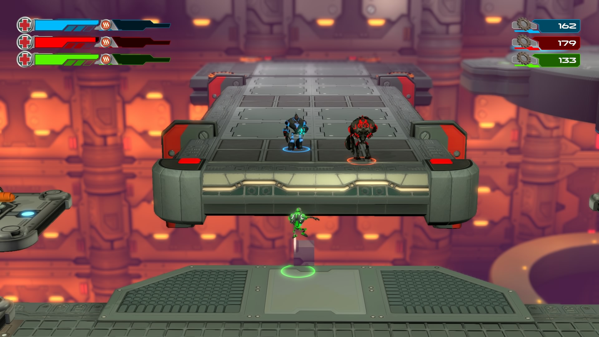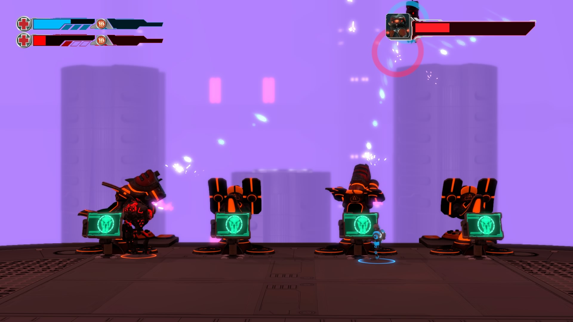 Gameplay consists of basic platforming in an isometric viewpoint. You use the left stick to move, and the right stick to target an enemy. R2 fires, and square melees. It’s pretty awkward, because aiming is not particularly precise and your character only moves in eight directions. I think Yorbie would have benefited from being a twin-stick shooter instead of what we got. There’s light platforming, but the camera angle is your enemy here, and you can expect to leap off edges on accident and not seeing platforms entirely. You can collect cogwheel-shaped coins and energy tubes to upgrade your weapons, which can help to clear out rooms more quickly and with fewer deaths.