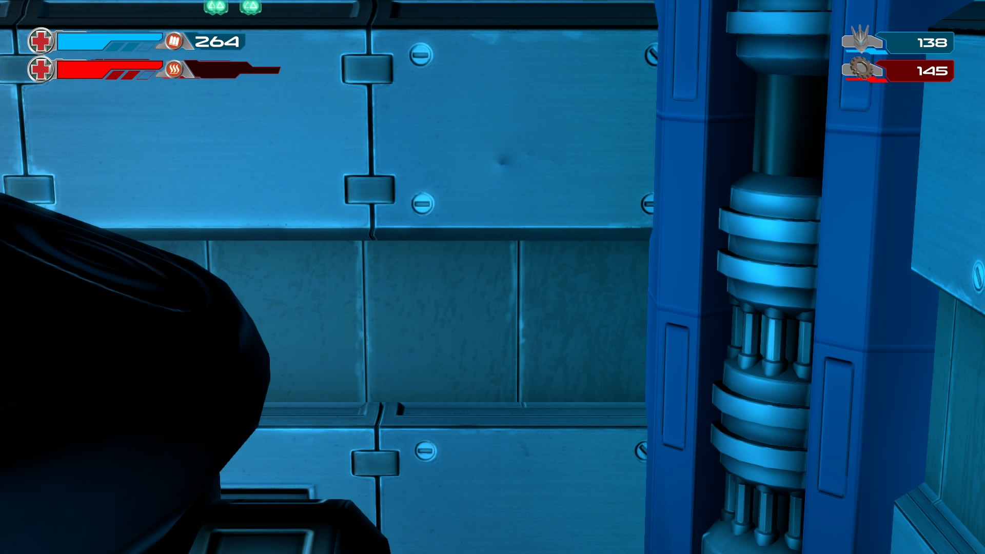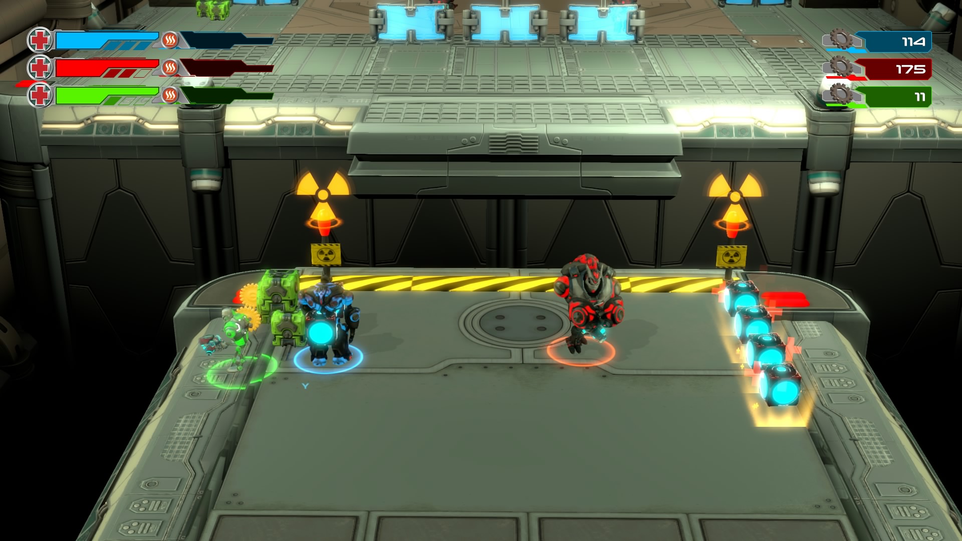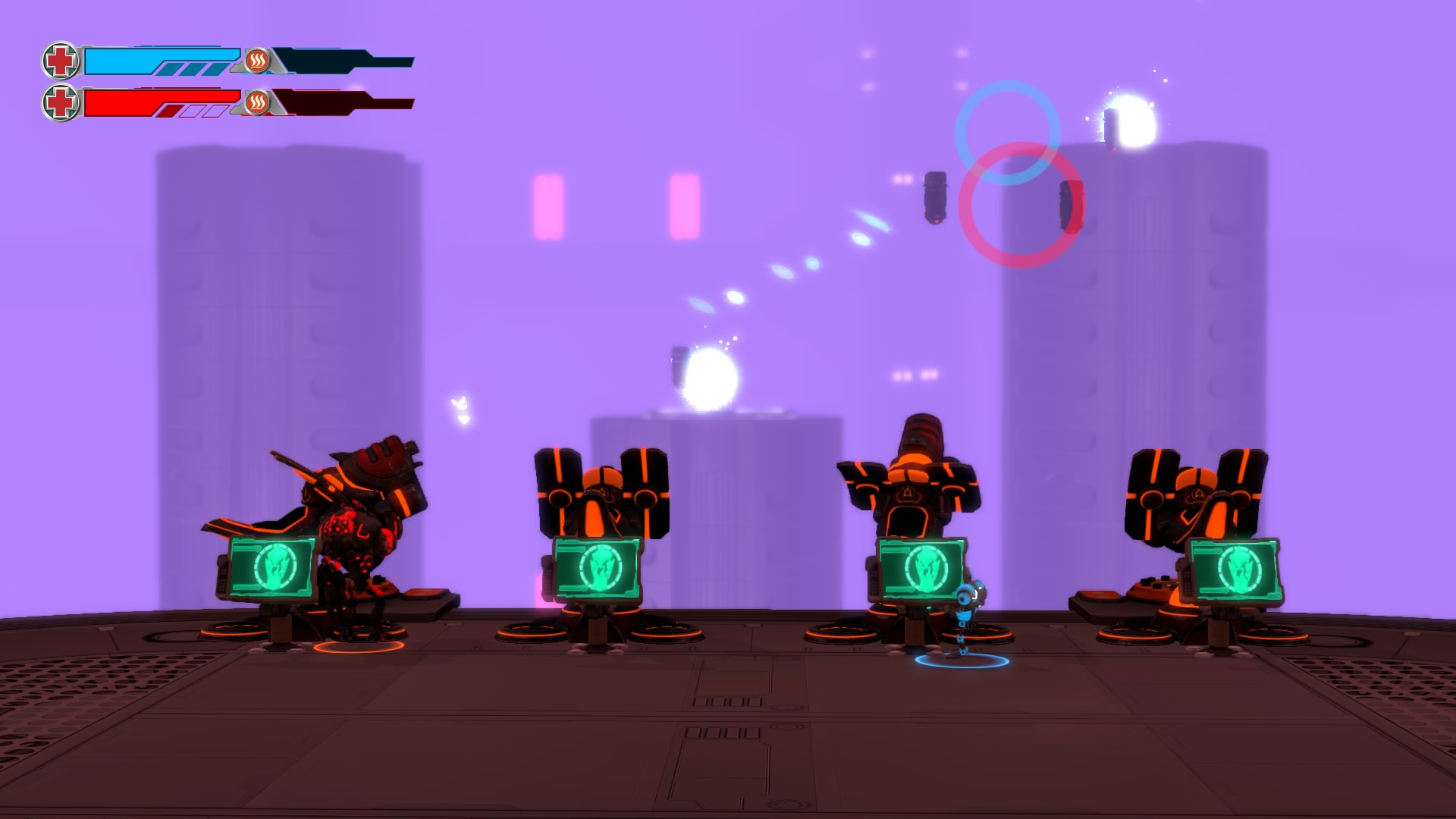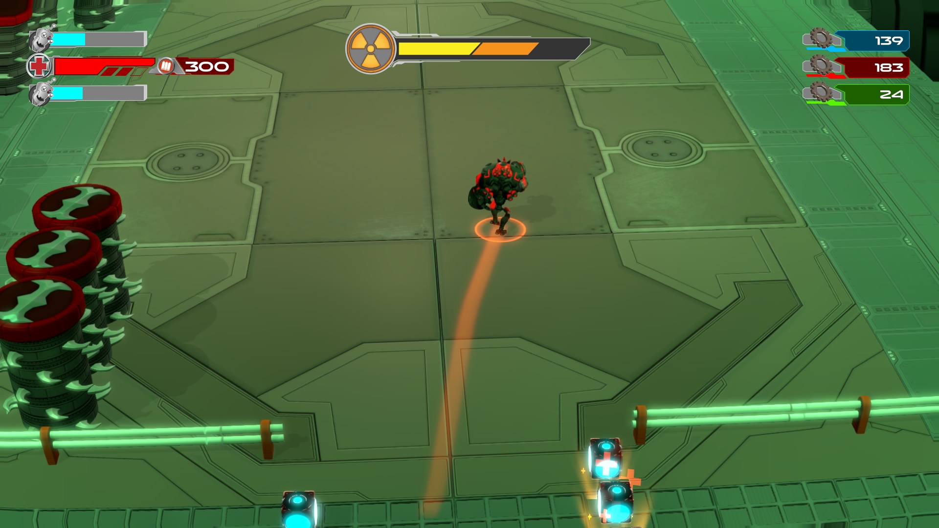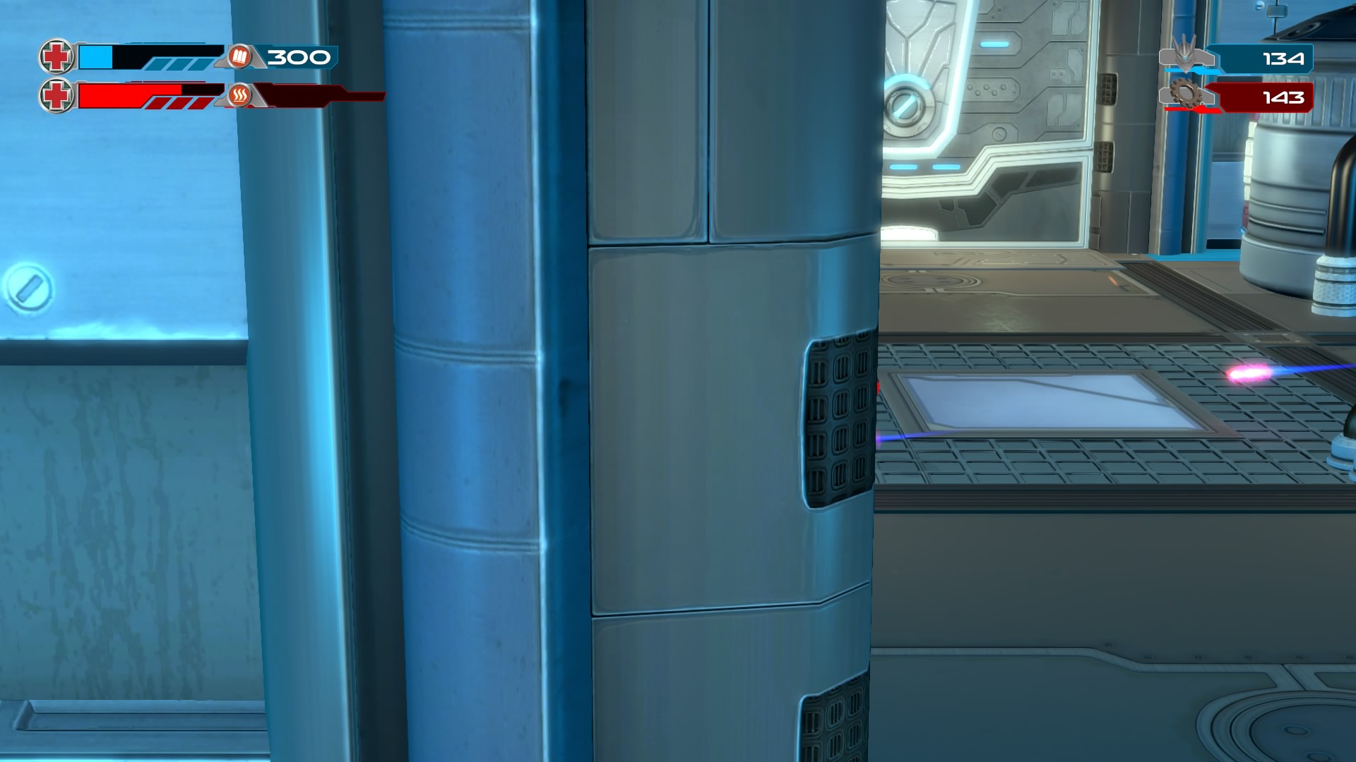 Gameplay consists of basic platforming in an isometric viewpoint. You use the left stick to move, and the right stick to target an enemy. R2 fires, and square melees. It’s pretty awkward, because aiming is not particularly precise and your character only moves in eight directions. I think Yorbie would have benefited from being a twin-stick shooter instead of what we got. There’s light platforming, but the camera angle is your enemy here, and you can expect to leap off edges on accident and not seeing platforms entirely. You can collect cogwheel-shaped coins and energy tubes to upgrade your weapons, which can help to clear out rooms more quickly and with fewer deaths.